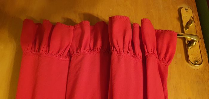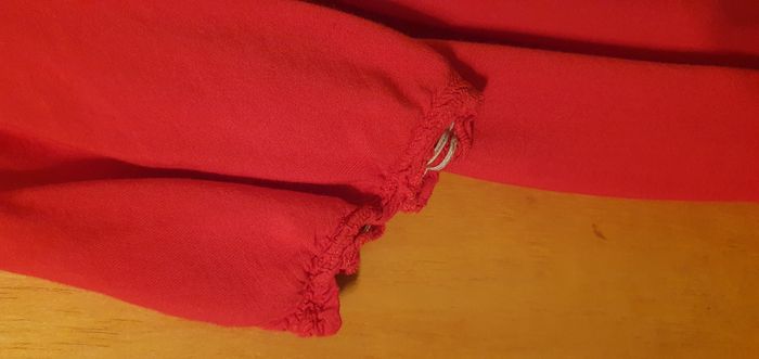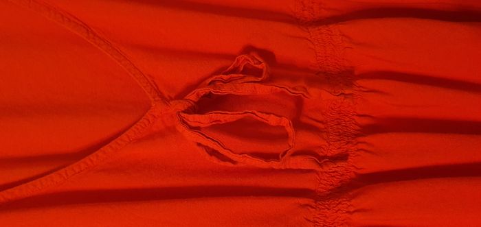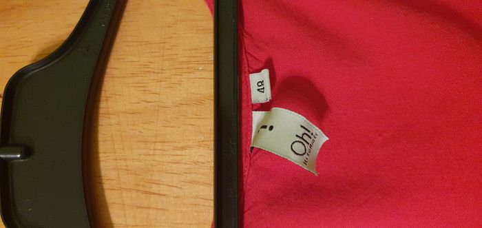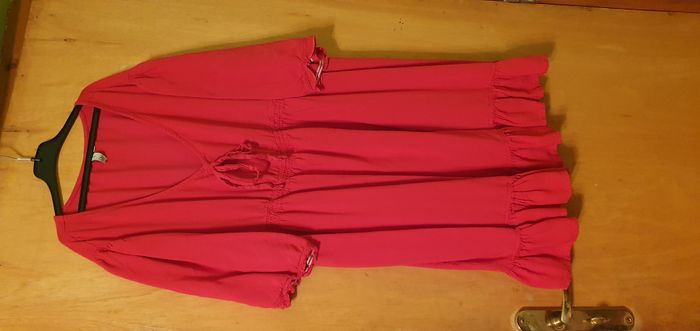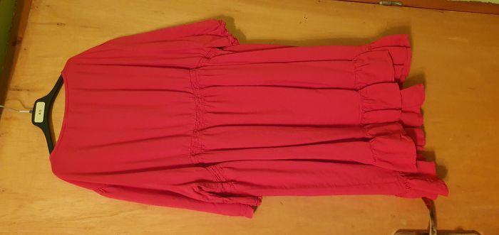 Tunique rouge, taille 48, collection Oh! les formes des 3 Suisses, 100% viscose, avec lien décoratif à nouer sur le décolleté arrondi, manches au coude 34cms, empiècement élastiqué à la taille, volant de 10cms en bas. Largeur d'épaules 44cms, largeur d'aisselle à aisselle 60cms, largeur taille 52cms (élastique non étiré), longueur 83cms.
