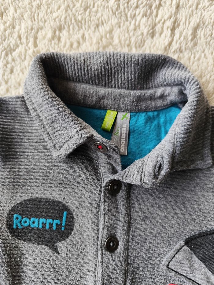 Lot de 6 vêtements, taille 9 mois. Bébé garçon Très bon état Détails : - pull maille Skate the world, Orchestra - polo dinosaure, Orchestra - pantalon turquoise rock, Orchestra - t-shirt manches longues moutarde, Orchestra - pantalon velours doublé bleu, dinosaure, DPAM - body rayé, DPAM