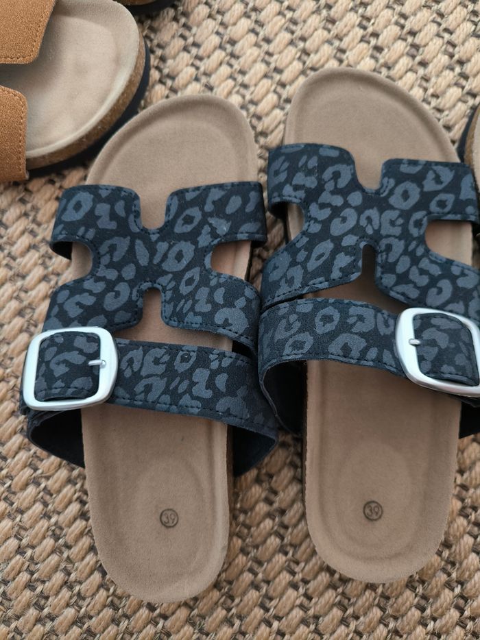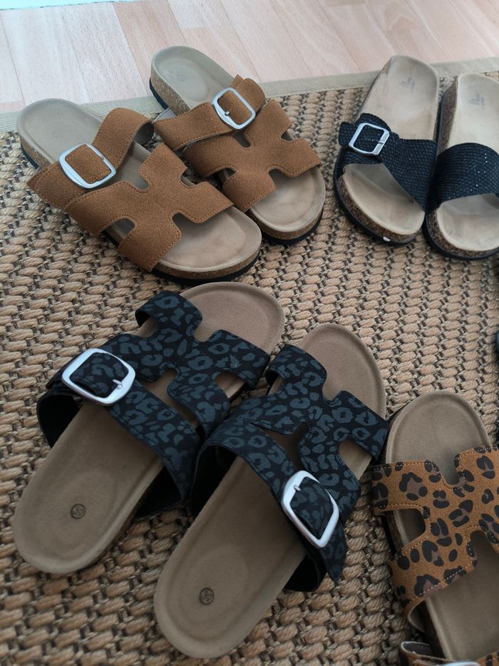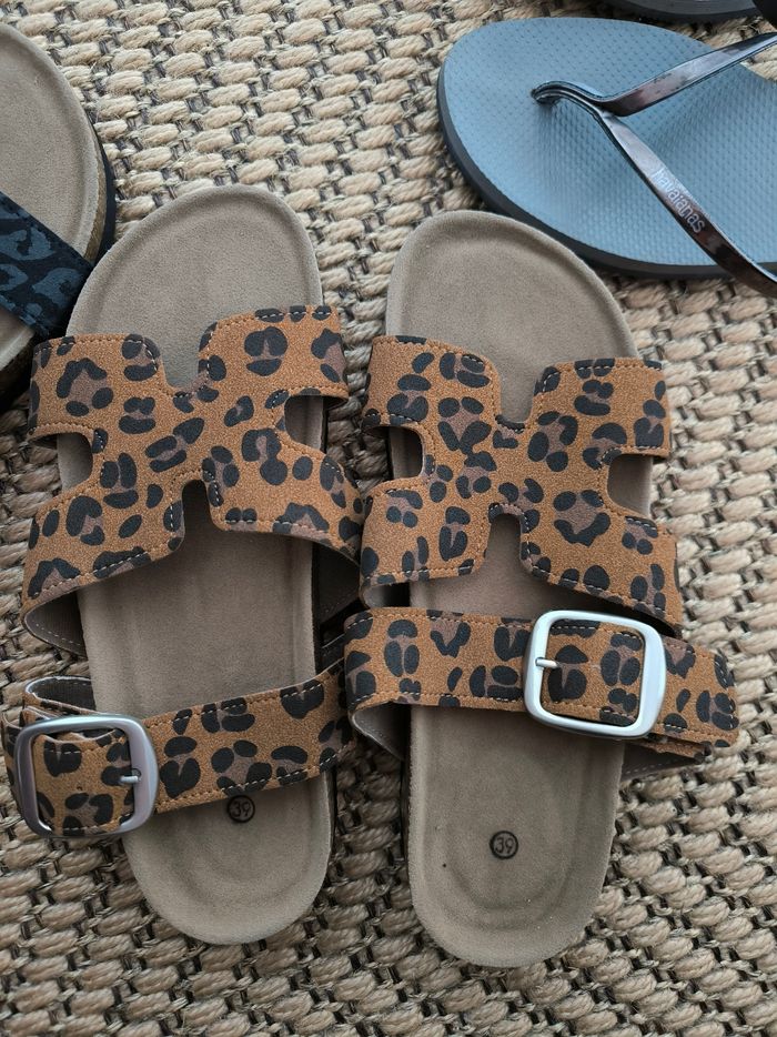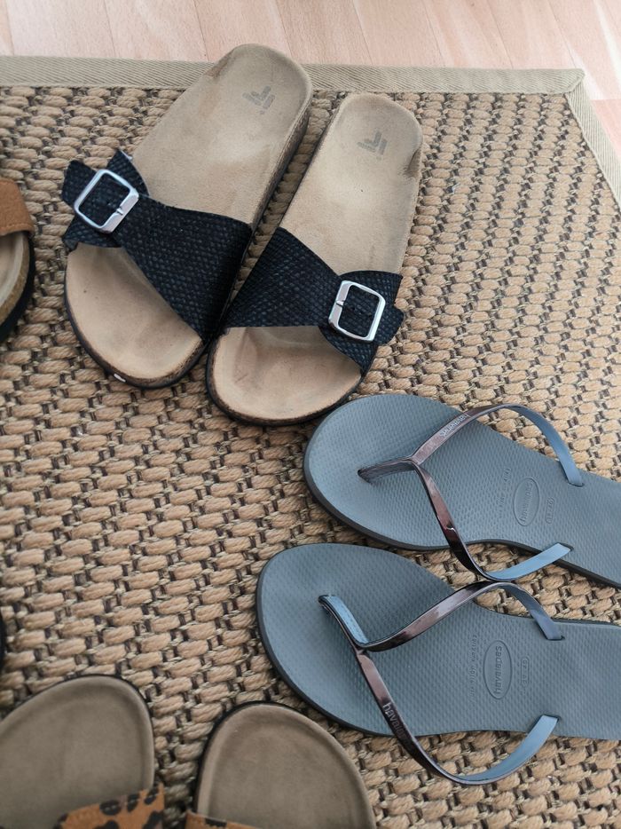 1 paire de tongues gris métallisé Havaianas - très peu portée 1 paire de sandales noires à paillettes - très peu portée 1 paire de sandales camel - très peu portée 2 paires de léopards JAMAIS PORTÉES