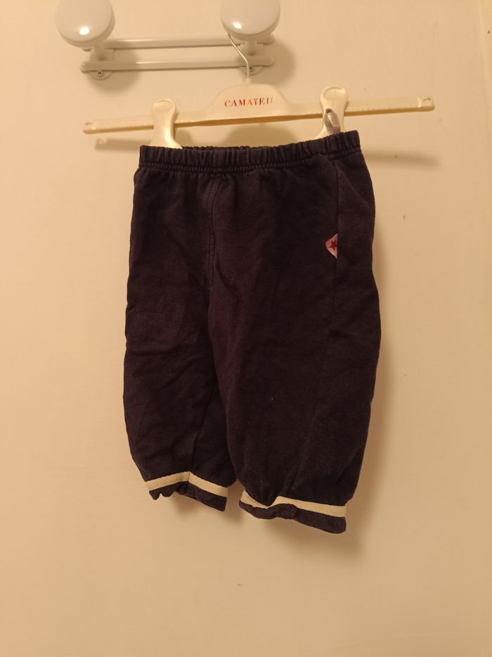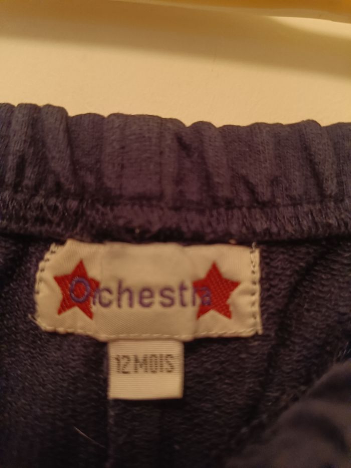 pantalon de jogging confortable de la marque Orchestra. Couleur : Bleu marine avec liserés beiges aux chevilles. Taille : 12 mois. Détails : * Taille élastiquée pour ne pas serrer le ventre de bébé. Petit écusson étoile sur le côté. Matière souple type molleton, idéal pour la liberté de mouvement. État : Bon état général.