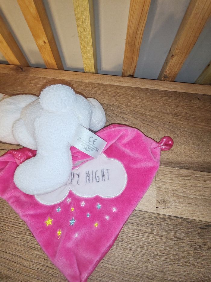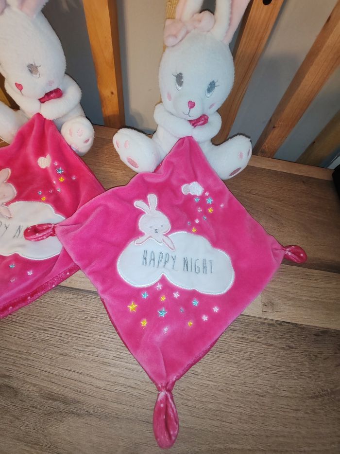 Doudou Lapin Blanc Mouchoir Rose fushia Happy Night Simba toy Étiquette marque présente Sur les 2 25 euros Envoi en relais