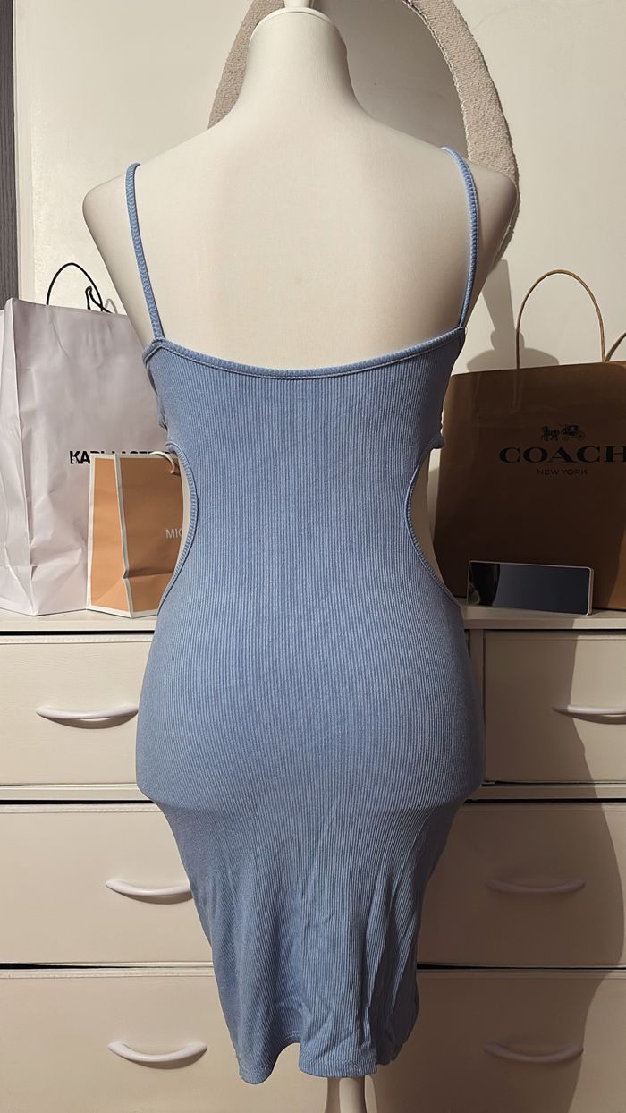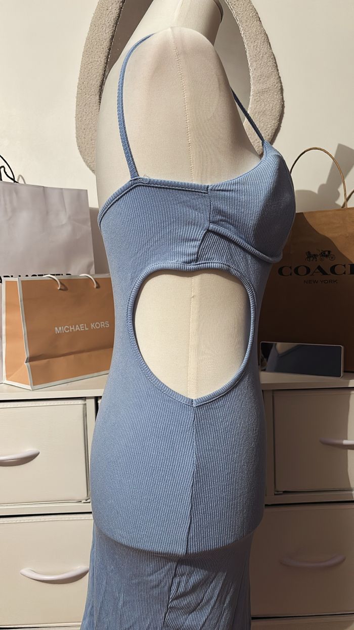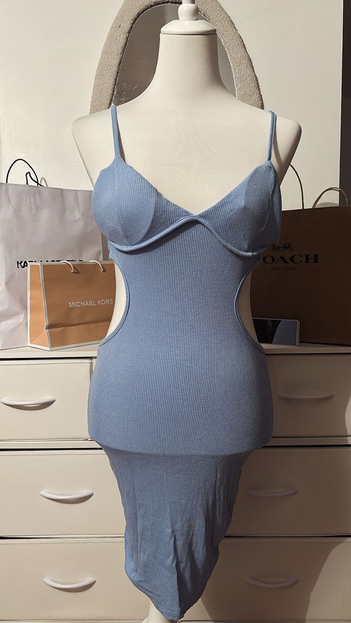 5€ 🪩 Robe côtelée correspond à un 34/36 💙 Ouverture sur le côté 📏 Dimensions : longueur 94cm, largeur 36cm. 📦 État : Très bon état Matière : 95% viscose, 5% élasthanne 💙 Robe bleue côtelée – coupe moulante & découpes tendance 💙 Robe bleu clair en maille côtelée extensible. Sa coupe moulante épouse parfaitement les formes tout en restant confortable grâce à sa matière stretch. Coque au niveau de la poitrine. Les bretelles fines et le décolleté structuré mettent en valeur le buste, tandis que les découpes sur les côtés apportent une touche très tendance et allongent la silhouette.