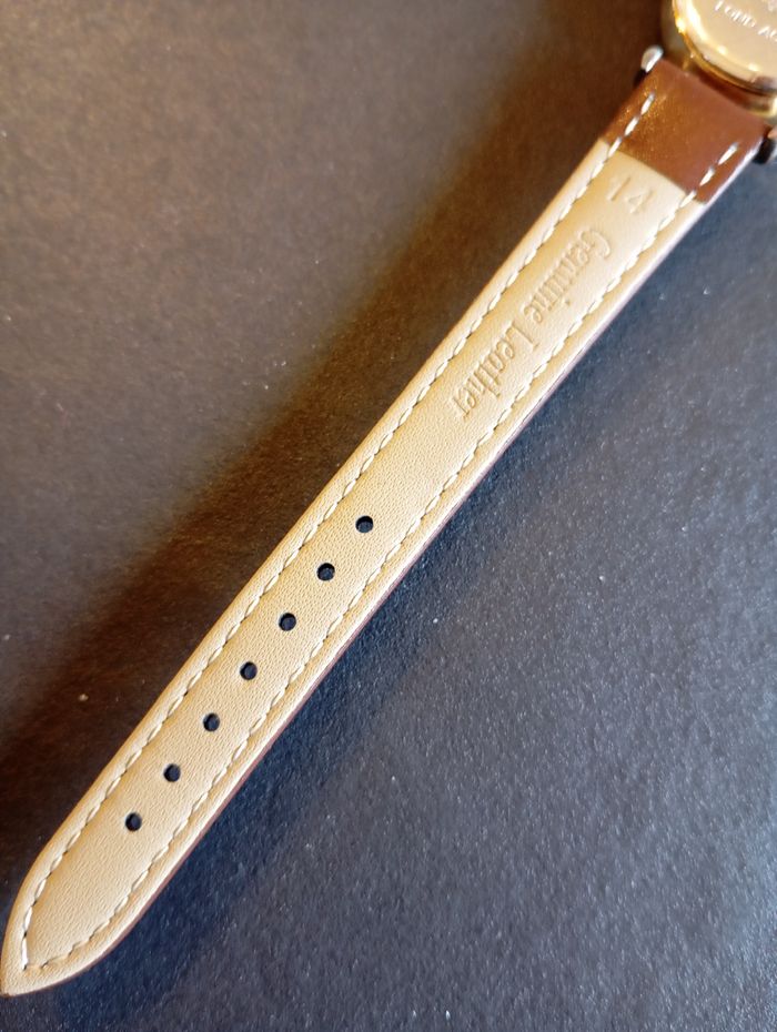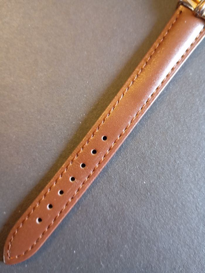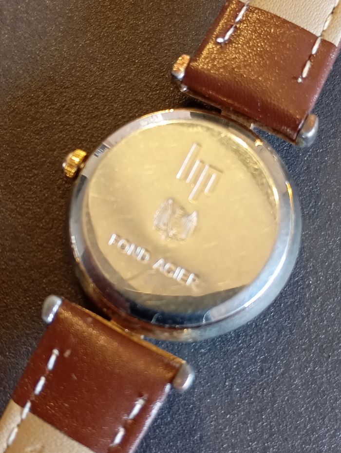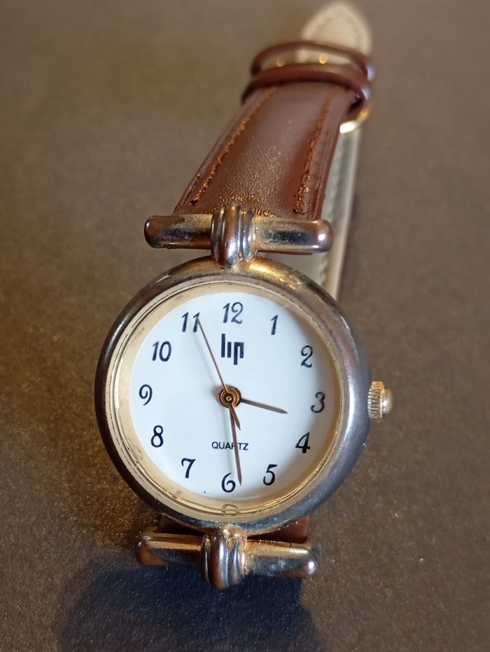Montre Lip dorée vintage Fonctionne parfaitement. Pile neuve pour la vente. Patiné par le temps. Mouvement Quartz. Très jolie petite dorée. Bracelet en cuir neuf Boitier 26 mm