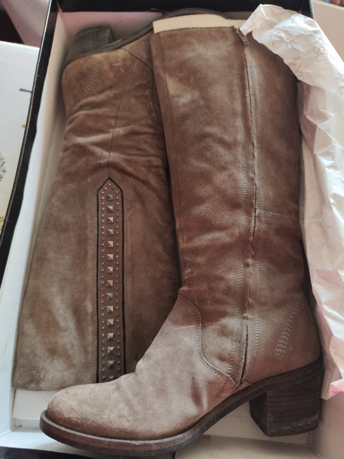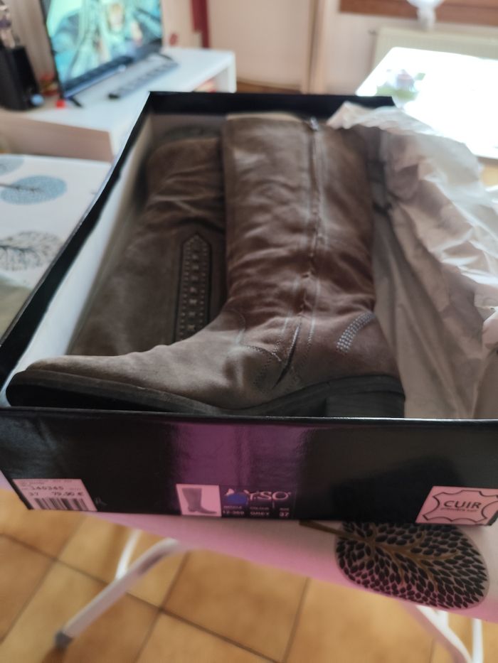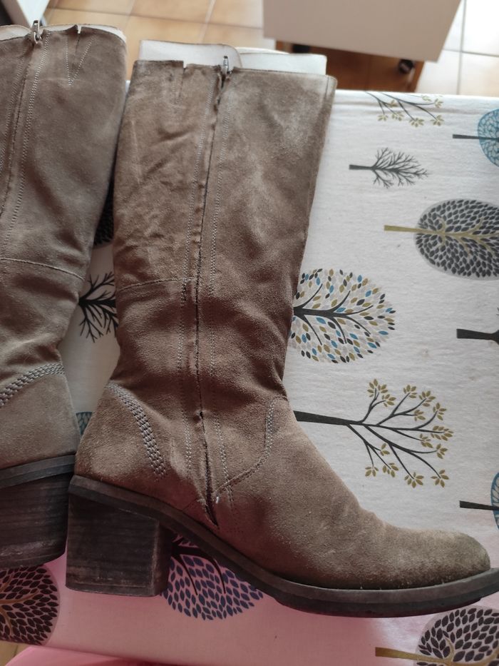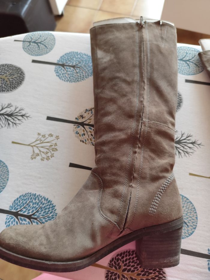 Bottes en cuir et en daim Grises Talons carré Pointure 37 Un peu usé sur un côté voir photo Sinon bon état Fermeture éclair N'hésitez pas à regarder mon dressing pour faire un lot