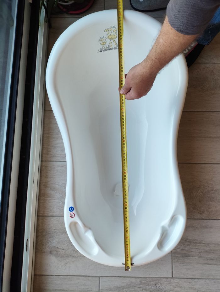 baignoire bébé avec son pied. Longueur ~ 83,5-84 cm - Motif : Girafe - Couleur : Blanc En très bon état Bouchon de vidange très pratique Pied solide, 2 emplacements de rangements en dessous Ne prend pas beaucoup de place une fois replié, très pratique. Hauteur du pied: ~ 100 cm Pied replié : largeur : ~10 cm Pas de livraison possible Remise en main propre