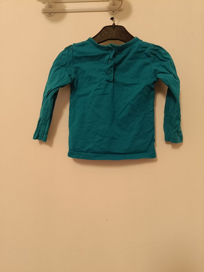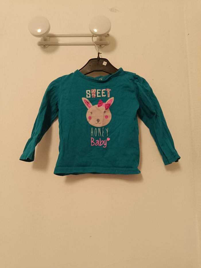 tee-shirt à manches longues de la marque In Extenso. Motif : Illustration adorable d'un lapin avec un petit nœud rose et l'inscription "Sweet Honey Baby". Couleur : Vert canard / émeraude. Taille : 9 mois (74 cm). Détails : * Ouverture par boutons-pressions au dos pour faciliter l'habillage. Petites fronces aux épaules pour un effet légèrement bouffant. État : Bon état général.