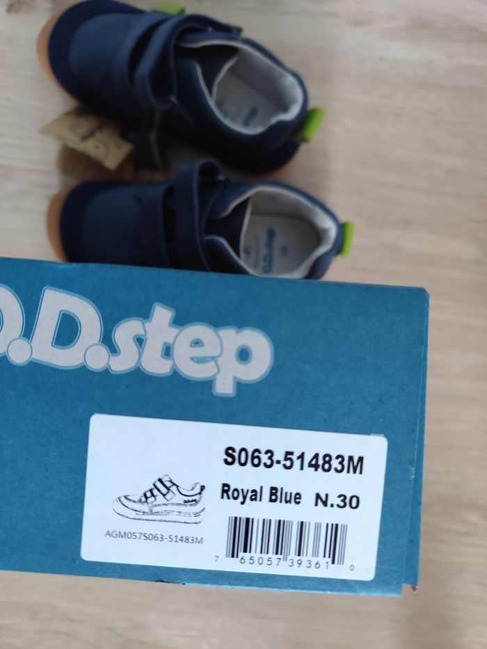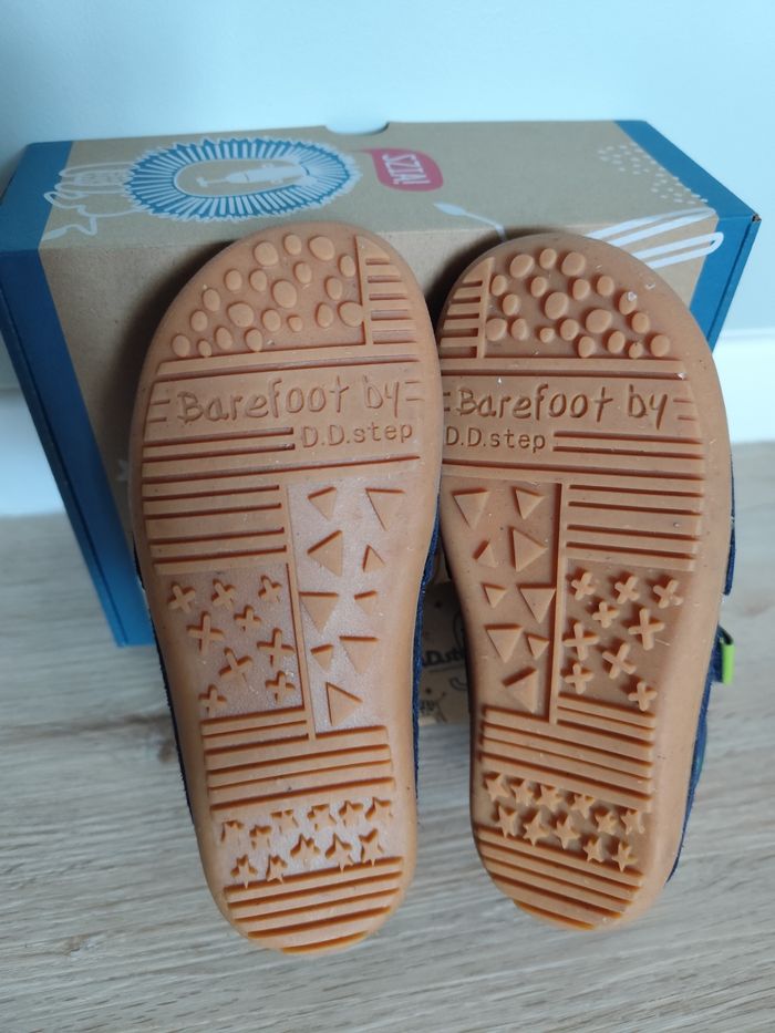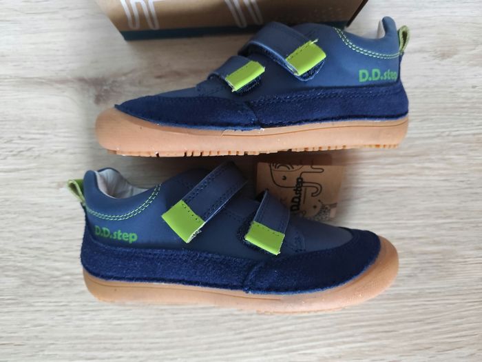 Une paire de baskets / sneakers en cuir, coloris bleu marine et détails verts. Marque D.D. Step, modèle barefoot Pointure 30, longueur semelle intérieure 19.1 cm Elles sont neuves dans leur boîte d'origine