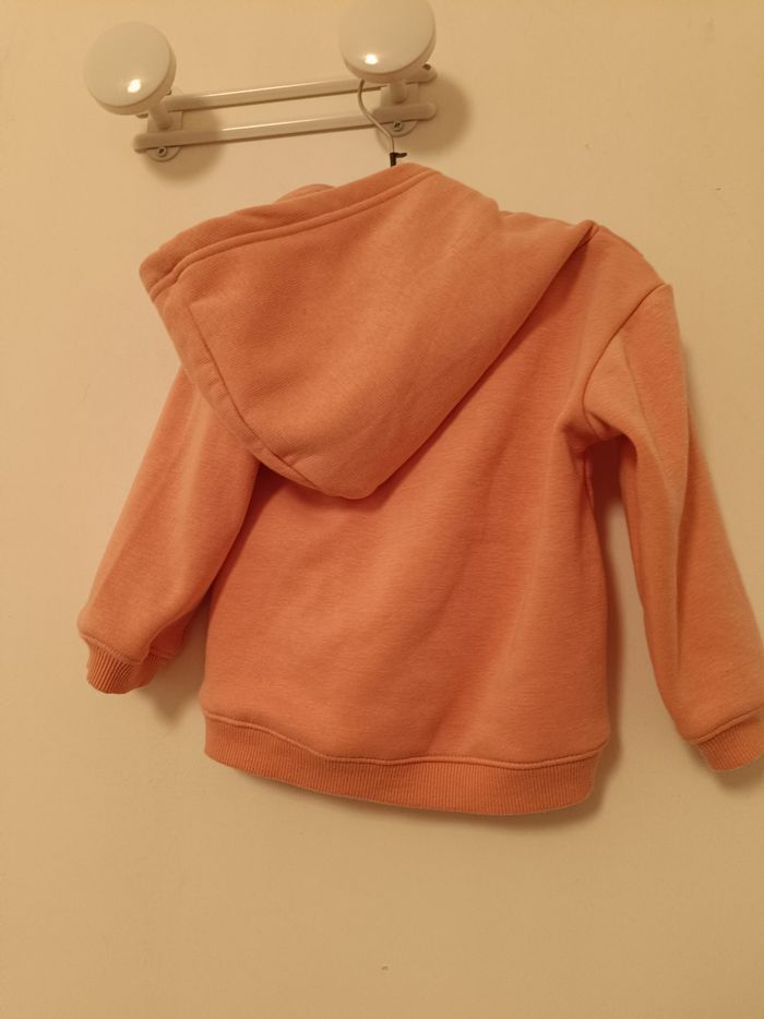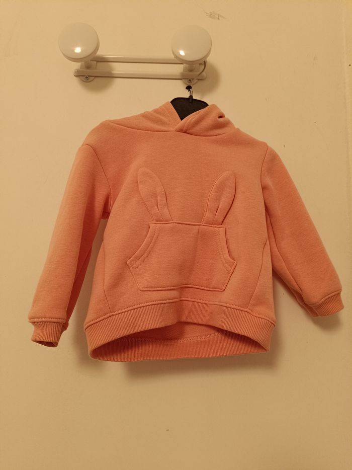 sweat à capuche tout doux de la marque Kiabi. Design : Couleur pêche/saumon avec une poche kangourou surmontée de petites oreilles de lapin en relief. Taille : 12 mois (80 cm). Matière : Intérieur en polaire toute douce pour garder bébé bien au chaud. Détails : Finitions bords-côtes aux poignets et à la taille pour un bon maintien. État : Très bon état.