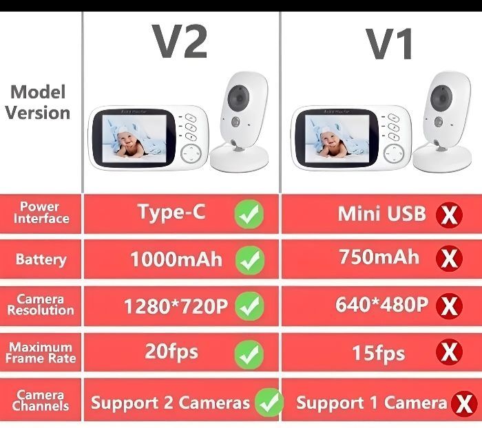 Neuf, jamais servi, boîte scellée ! Babyphone robuste et efficace. Connexion simple, rapide et sans WiFi. Nouveau modèle avec : * Une bonne autonomie * Une image en couleur * Possibilité de connecter une 2ème caméra C'est le modèle V2, plus performant que le modèle V1 que l'on trouve majoritairement sur internet. Vous trouverez sur les photos les caractéristiques des 2 modèles Boîte complète : un moniteur + une caméra + 2 chargeurs + une notice Envoi rapide.