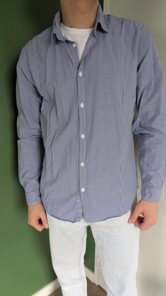 Chemise de marque Jack Jones, de la gamme Premium. Motif de type vichy blanc et bleu. 100% coton Très bon état. ​Col boutonné, manches longues, tissu de qualité supérieure.