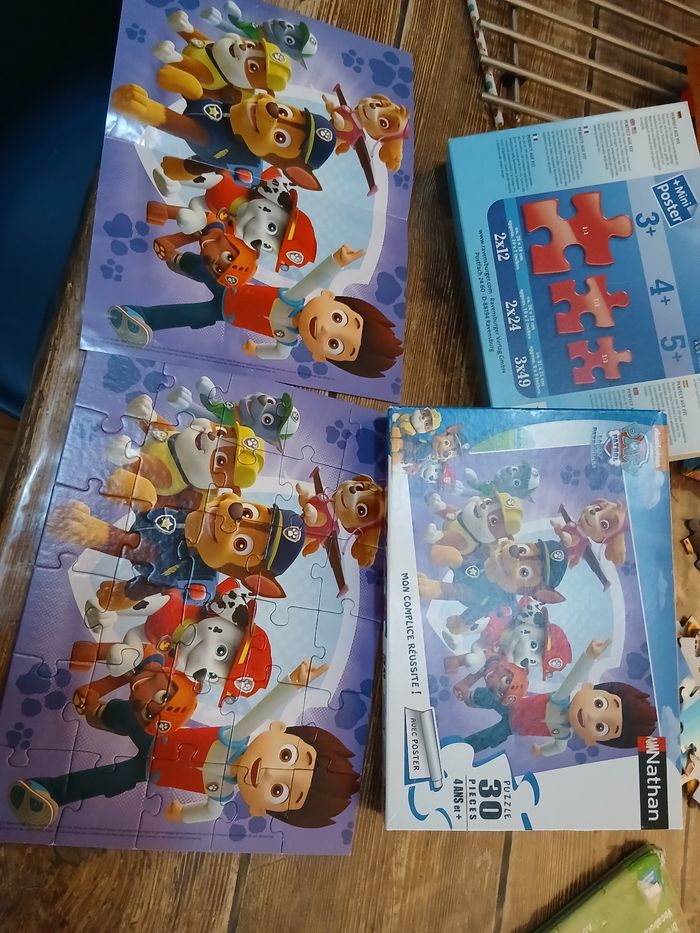 Lot de 3 puzzles en bon état. Juste une pièce usée visible en photo. Ne gêne en rien le puzzle + une trousse en bon état extérieur tachée simplement à l'intérieur - Marcus intéractif traces d'usure sur le nez sur la photo mais c'est tout. Il est complet, fonctionne à piles il faudra en mettre des neuves. Il y a 3 lettres qui présentent des marques d'usure cf photo. Testé avant envoi fonctionne bien. - Deux véhicules chase un plus grand avec le chien fixe, en parfait état, l'autre plus petite sans chien avec un rétroviseur cassé. Tout est visible sur photos. Je peux envoyer d'autres photos plus détaillées Faire proposition dans la limite du raisonnable.