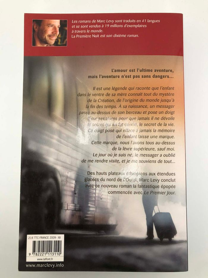 Réduction dès 2 articles achetés 5%, 3 articles 10%, 5 articles et plus 20% Me demander SVP pour que j'applique la réduction avec les frais de port au plus bas. Résumé: Vous avez aimé "Le Premier Jour", voici la suite, un grand roman d'amour et d'aventures... L'amour est l'ultime aventure, mais l'aventure n'est pas sans dangers... Il est une légende qui raconte que l'enfant dans le ventre de sa mère connaît tout du mystère de la Création, de l'origine du monde jusqu'à la fin des temps. À sa naissance, un messager passe au-dessus de son berceau et pose un doigt sur ses lèvres pour que jamais il ne dévoile le secret qui lui fut confié, le secret de la vie. Ce doigt posé qui efface à jamais la mémoire de l'enfant laisse une marque. Cette marque, nous l'avons tous au-dessus de la lèvre supérieure, sauf moi. Le jour où je suis né, le messager a oublié de me rendre visite, et je me souviens de tout... Des hauts plateaux éthiopiens aux étendues glacées du nord de l'Oural, Marc Levy conclut avec ce nouveau roman la fantastique épopée commencée avec Le Premier Jour.