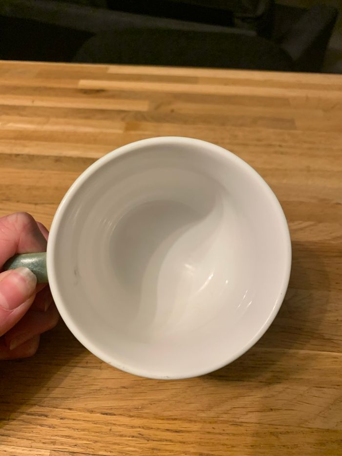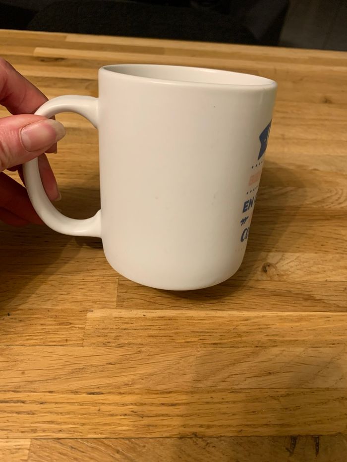 Mug blanc avec message. Passe au micro ondes et au lave vaisselle. En très bon état.