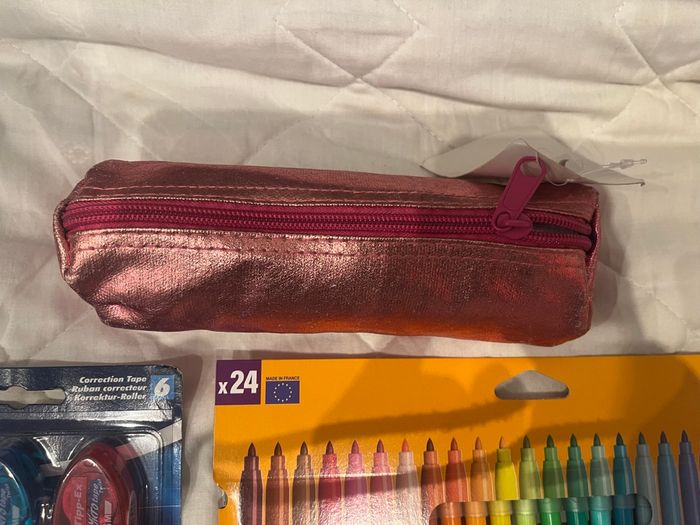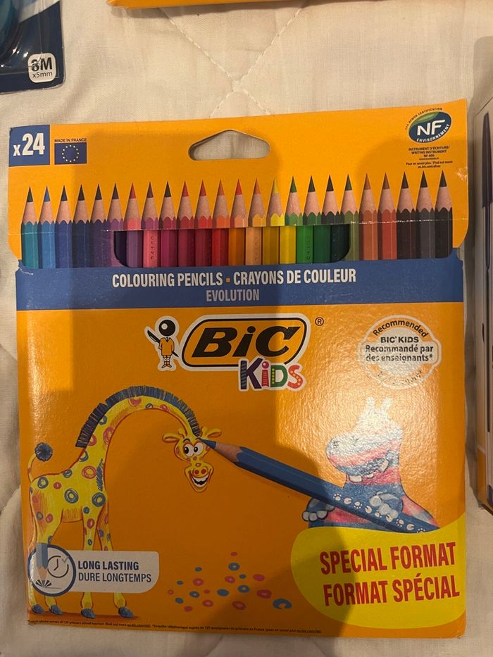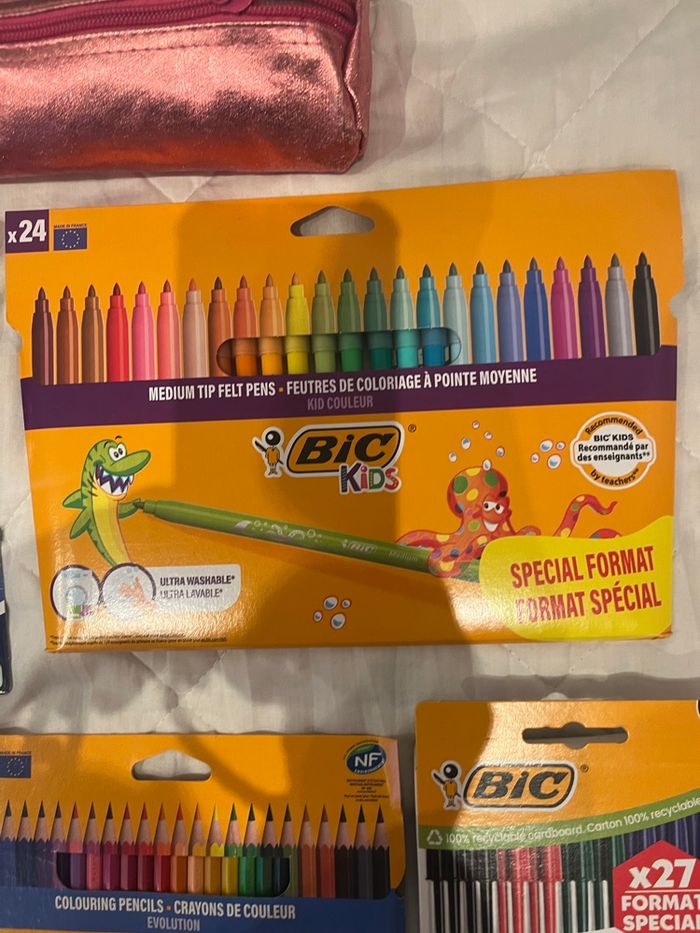 Lot de fournitures scolaires, Comprenant tout ce qu’il y a sur la photo. –un pack de 6 correcteurs - Une grosse boîte de 24 feutres, - Une boîte de crayons de couleur - Une boîte de 6 Stabilos - Une boîte de 27 stylos BIc - Une trousse Des produits de marque Neuf Envoi rapide
