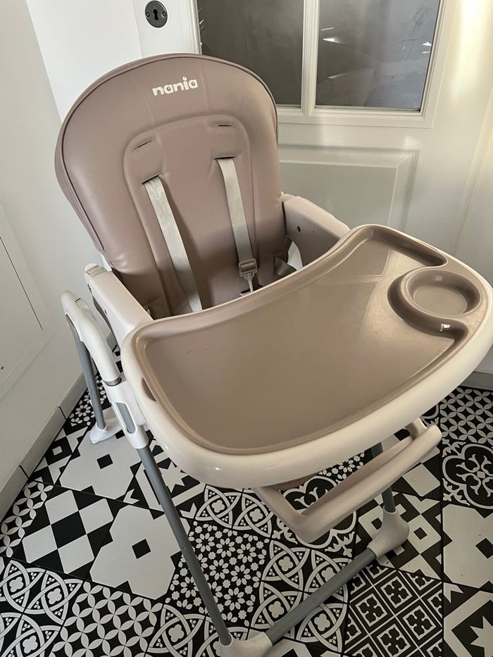 Vend chaise haute de marque Nania modèle Bianca en très bonne état utilisé 18 mois. Juste un défaut sur l’assise le cuir commence à s’enlever. Prend très peu de place se met derrière une porte pied assise et siège réglable sur plusieurs niveaux. A VENIR CHERCHER SUR PLACE ou siège besoin je peux me déplacer dans les environs (95 pontoise).