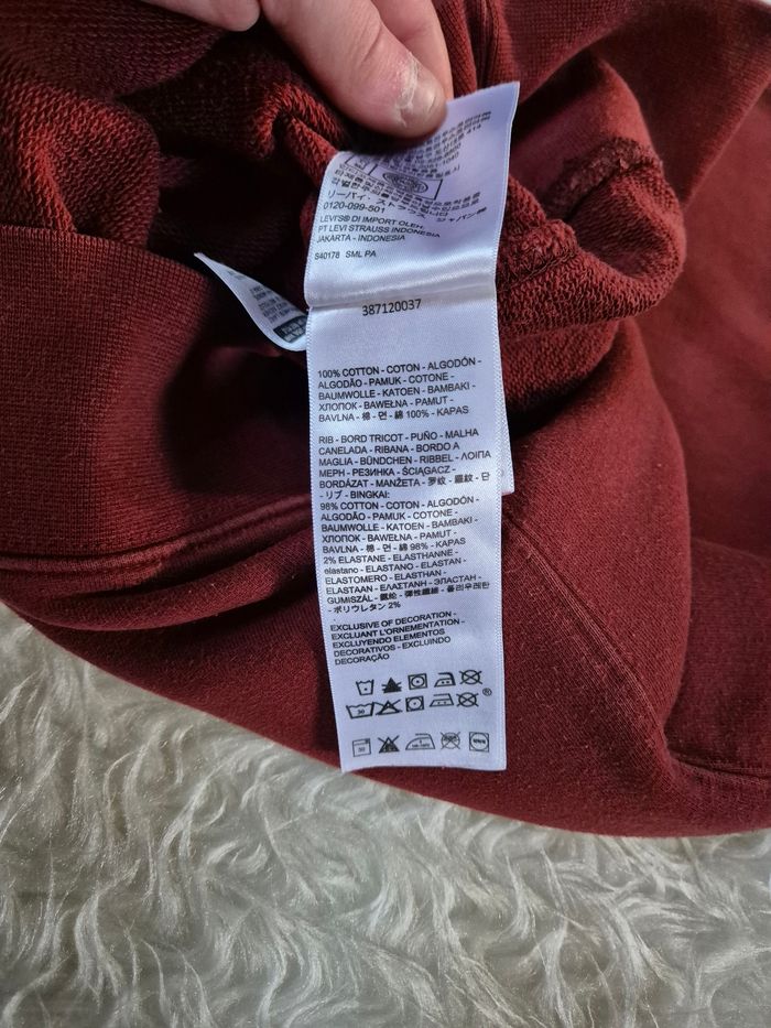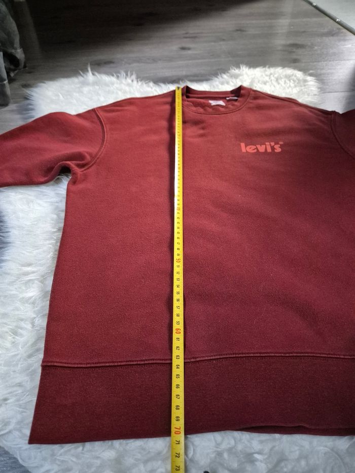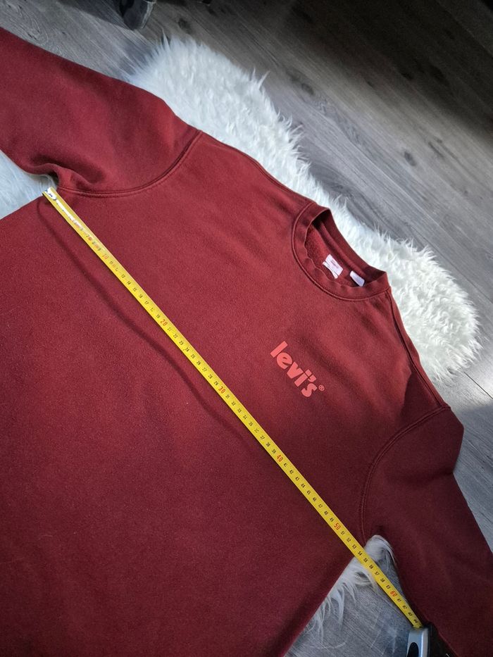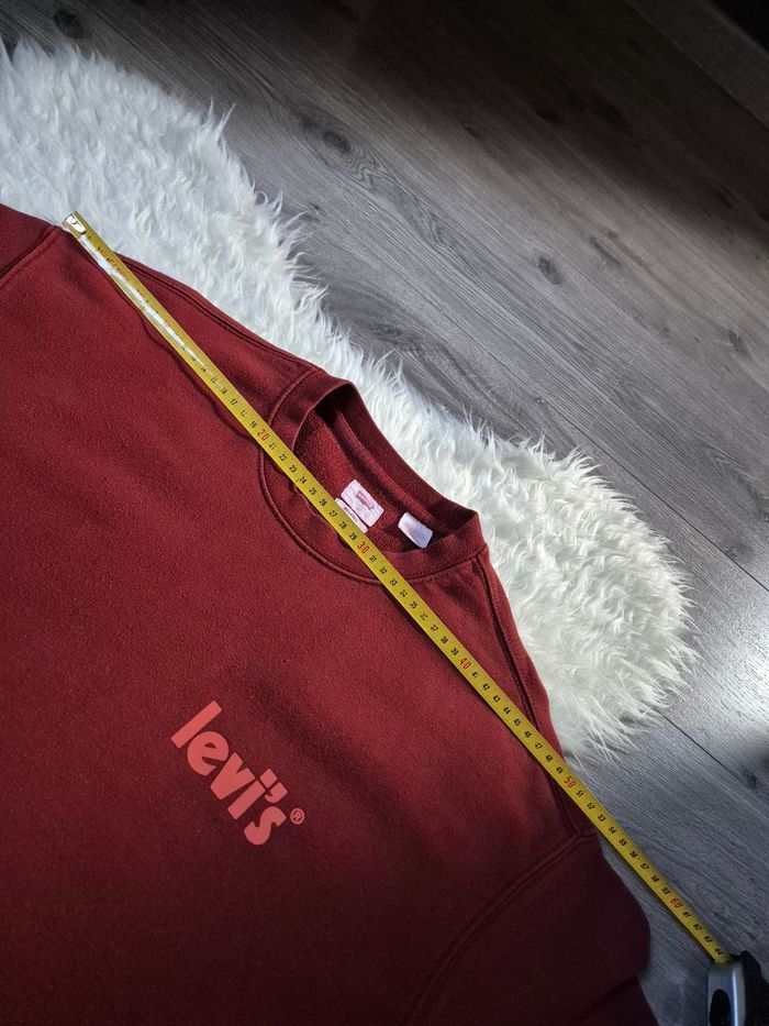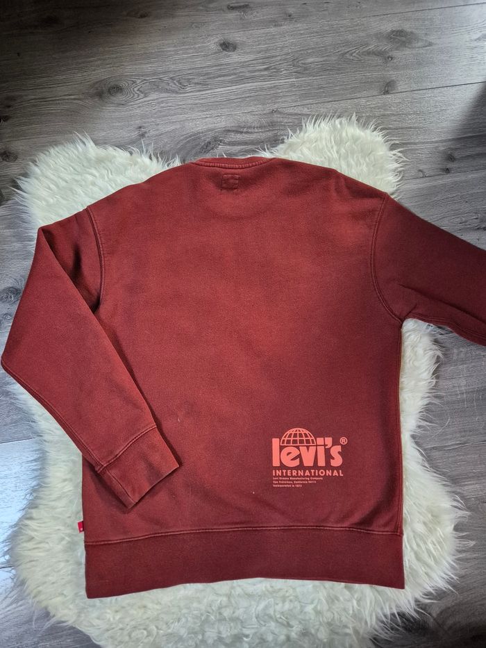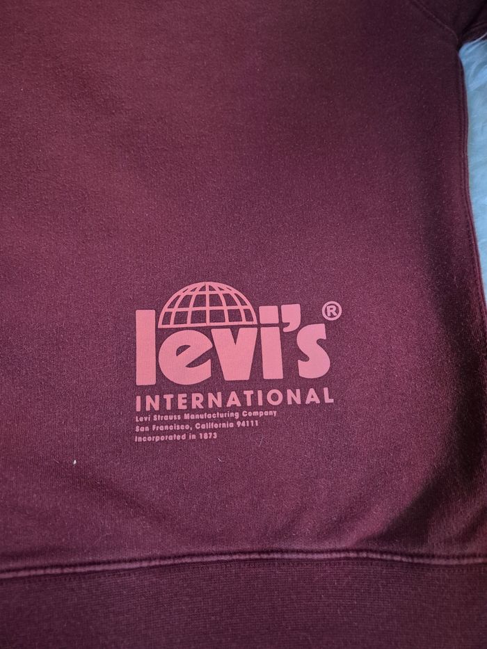 Sweat pour homme Marque Levi's, modèle Relaxed Graphic Crew Taille S Col rond Manches longues Finition base et bas des manches fines côtes coton et élasthanne légèrement élastiques Logo sérigraphié niveau poitrine + Logo imprimé Levi's INTERNATIONAL sur le bas du dos, coloris brique / corail Tissu 100 % coton coloris bordeaux / grenat Article en excellent état, peu porté, car vite devenu trop étroit pour mon fils...