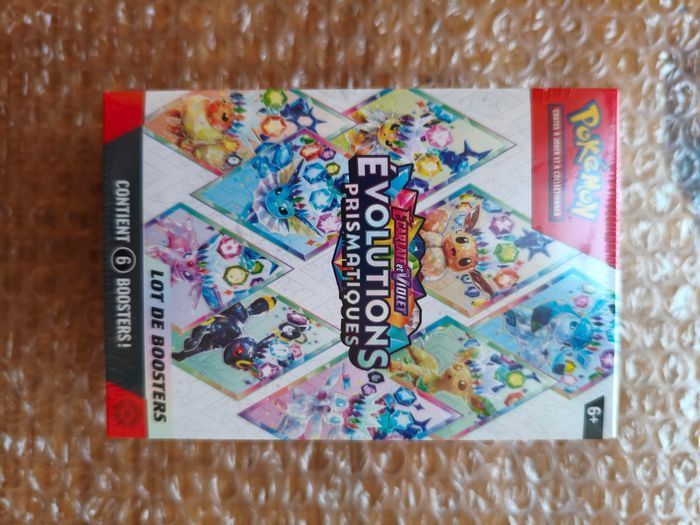 Bundle pokémon EV8.5 évolutions prismatiques contenant 6 boosters neuf scellé français. Provient de professionnel, Neuf! Non reconditionné, non recollé ou modifié. Préparation et envoi du colis filmé, scameur passez votre chemin.