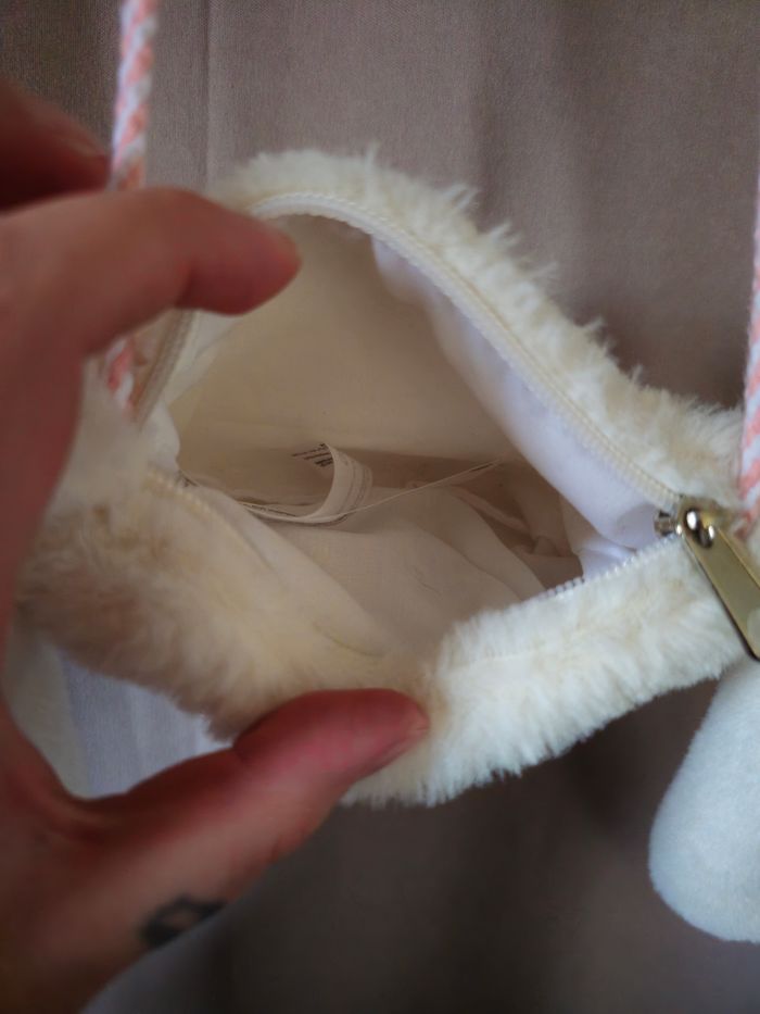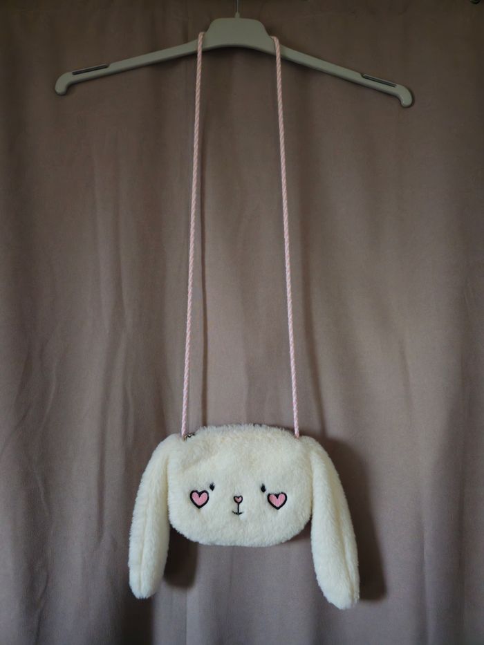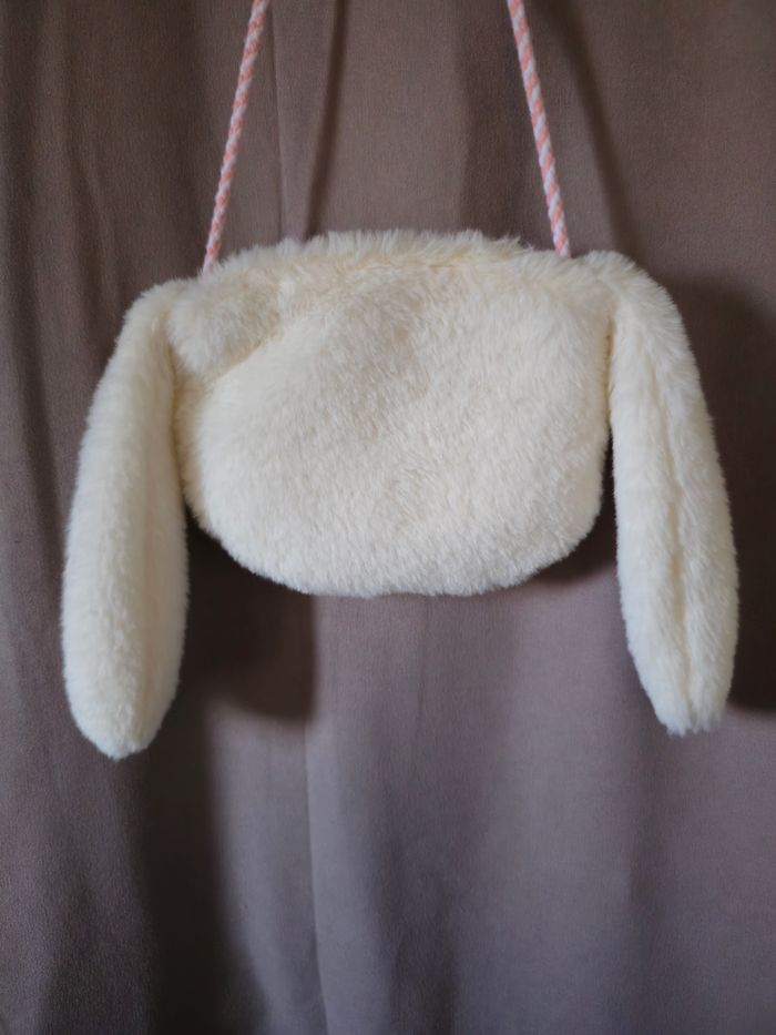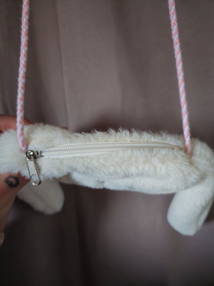 En très bon état. Fermeture fonctionnel testé Anse en corde rose et blanche. Fausse fourrure (pilou) Tête de lapinou avec petite joue rose en cœur 😍. 🐰🐇