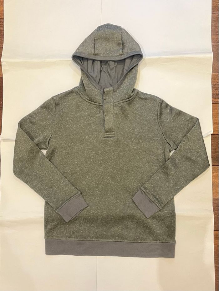 • Sweat à capuche gris ( couleur comme sur les dernières photos). Col boutonné. En coton et polyester Tient extrêmement chaud car tout doux à l’intérieur. Parfait pour l’hiver • taille 14 ans, XS, 158cm-164cm, kiabi 37cm entre les épaules et 57cm de longueur • en très bon état • n’hésitez pas à faire des lots
