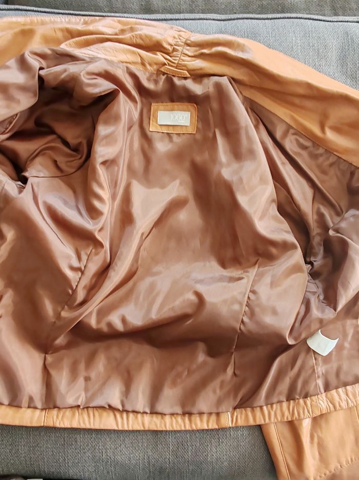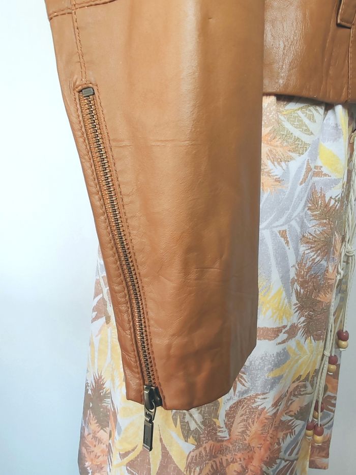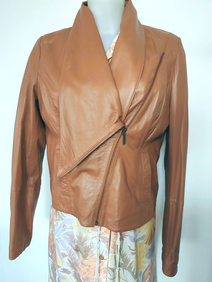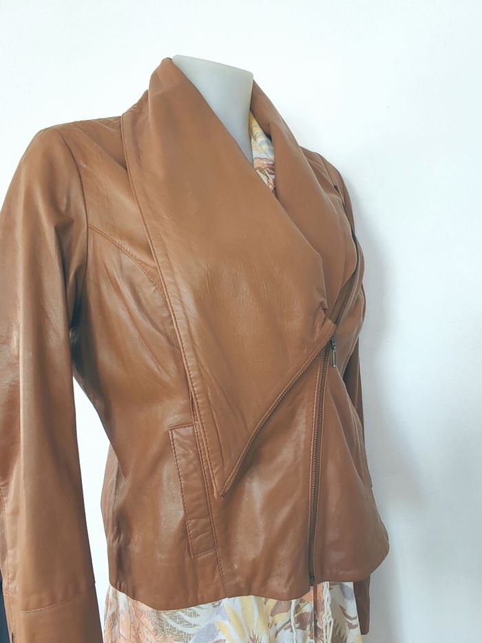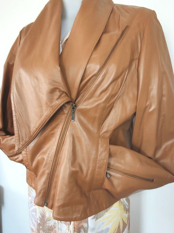 Mesure à plat épaule 44, largeur sous aisselles 54, longueur dos 55 Pièce de cuir haut de gamme — le cuir d’agneau offre souplesse et finesse Coupe originale (asymétrie) qui donne du style Modèle rare de la marque 1060 Clothes 100 % cuir d’agneau souple Doublure polyester Col châle asymétrique Fermeture par zip décentré Coupe ajustée, élégante, moderne Excellent état / peu portée