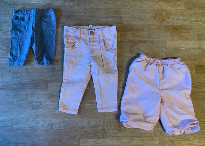 Lot de bas en 6m: - 1 legging court gris - 1 jean rose clair Hema - 1 jogging rose En très bon état sans taches ni trou