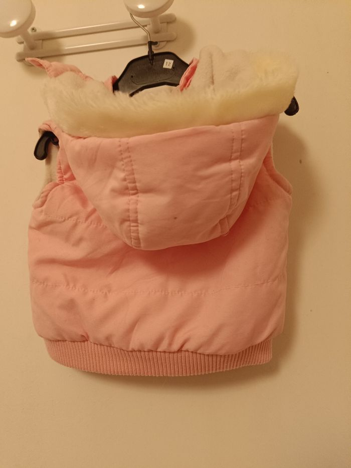 doudoune sans manches pour bébé fille, marque Cuteypie, taille 6/12 mois. Couleur : Dégradé de rose et blanc cassé avec de petites broderies étoiles et cœur sur la poitrine. Chaleur : Intérieur doublé en polaire blanche très douce et capuche bordée de fausse fourrure pour garder bébé bien au chaud. Pratique : Fermeture par zip surmontée d'un rabat à boutons pressions pour une meilleure isolation. Capuche amovible grâce à des boutons pressions (pratique pour les trajets en siège auto). Deux petites poches à l'avant avec pressions. Finition : Bas du vêtement élastiqué en bord-côte pour un bon maintien. État : Très bon état général. Idéal pour superposer sur un petit pull ou un gilet sans gêner les mouvements de bébé