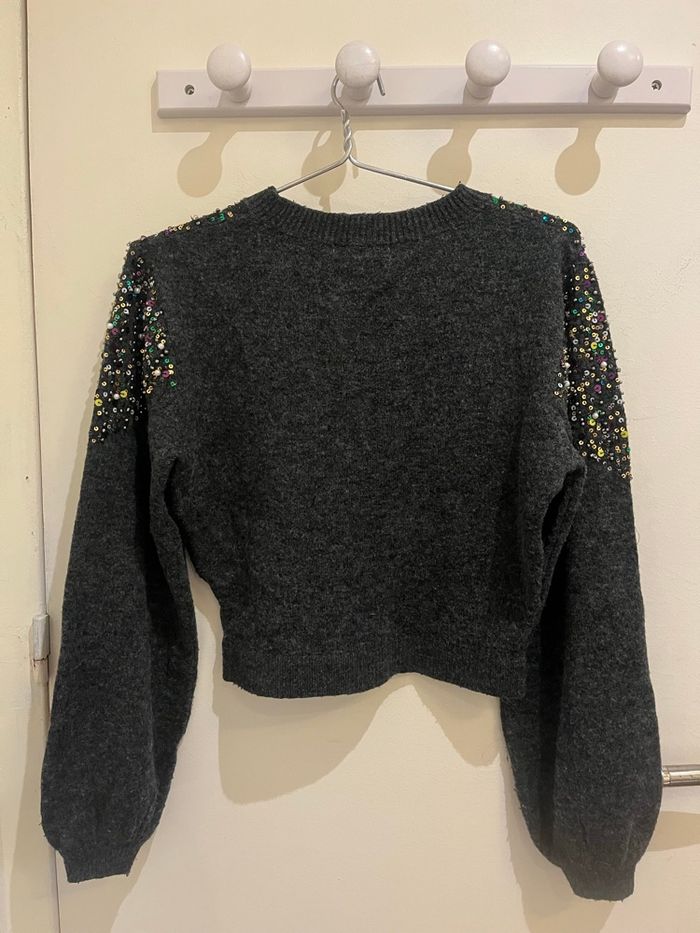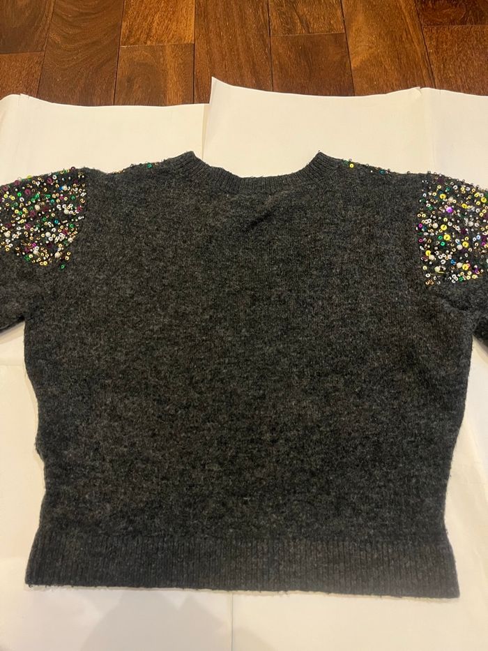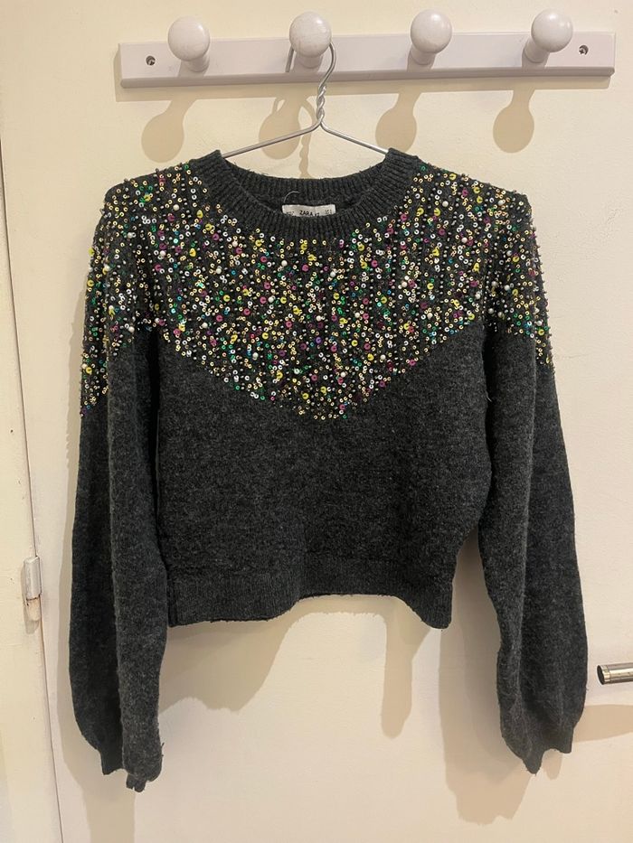 • Pull à col rond manches longues gris avec paillettes multicolore sur le haut. Très doux et confortable • taille S/36, zara knit mesures: 44cm entre les épaules, 50cm de longueur,47cm entre les aisselles • un peu bouloche mais sinon en très bon état
