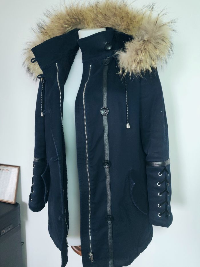 Manteau Maje femme T38  noir/bleu capuche bordée de fourrure