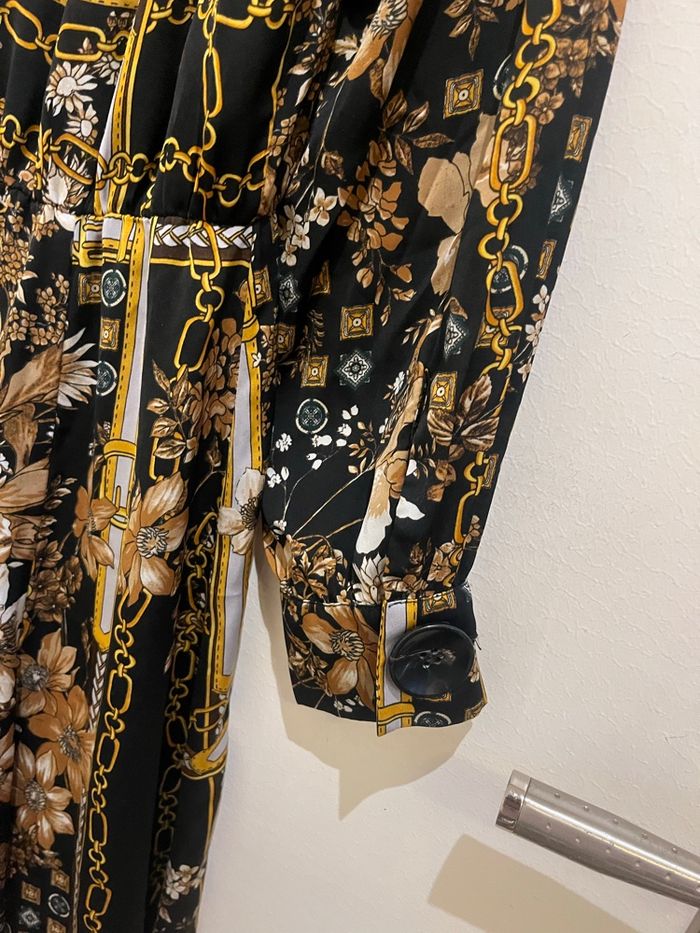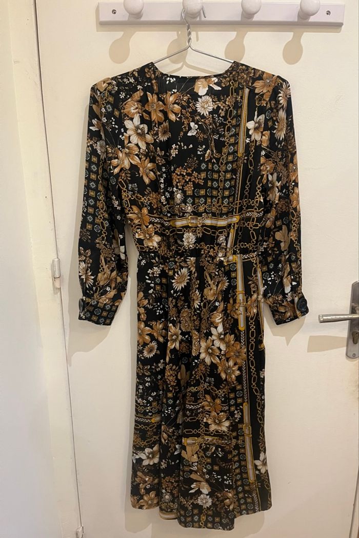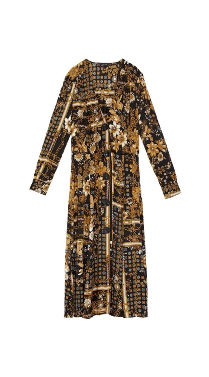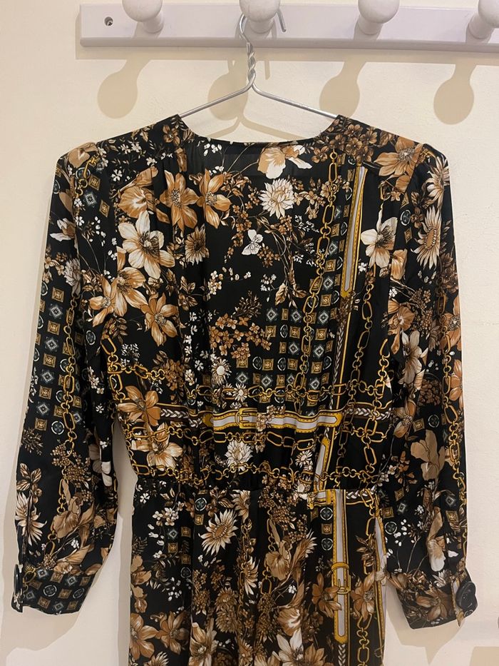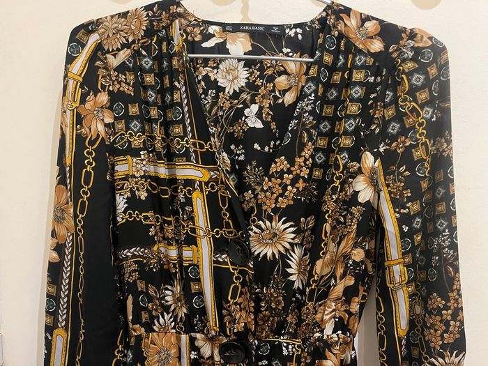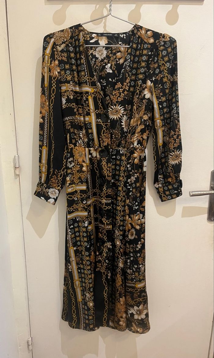 •Robe fluide avec décolleté en V et manches longues. Ourlet à fente sur le devant. Fermeture sur le devant par boutons bimatières ton sur ton. Boutons sur les manches. Motifs fleurs et chaînes noires, jaunes, marrons, blancs • taille S/36 zara mesures : 36cm entre les épaules ,42cm entre les aisselles ,113cm de longueur • en parfait état
