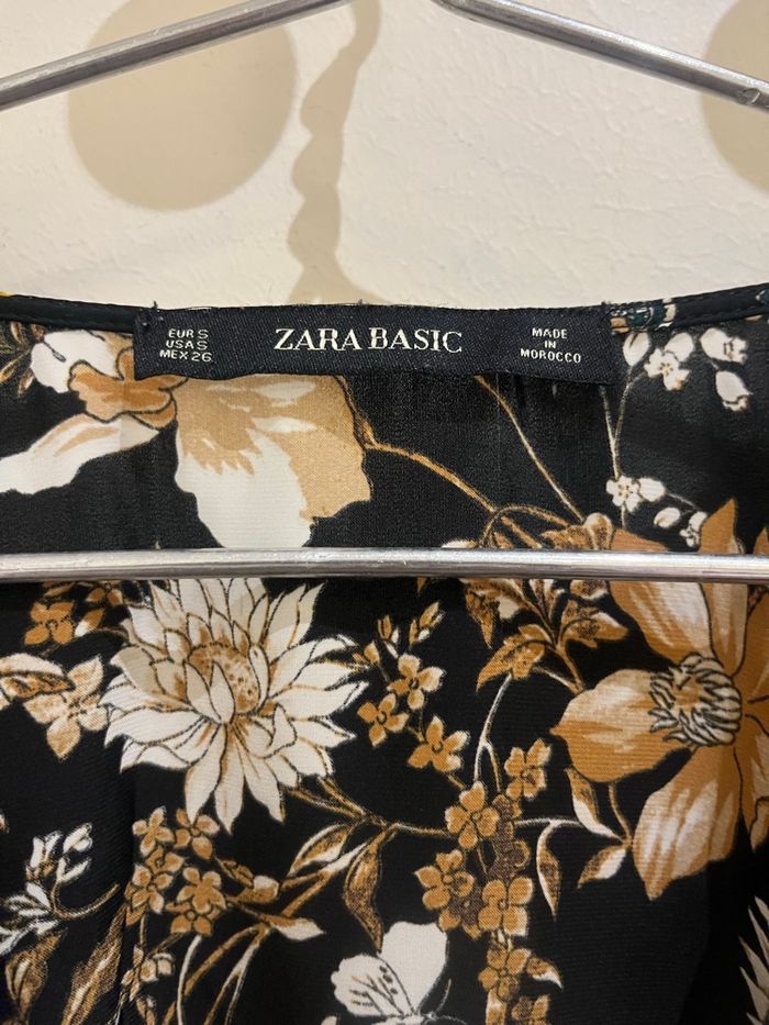 Robe longue manches longues col V portefeuille fleuri zara taille S noir jaune marron - photo numéro 1