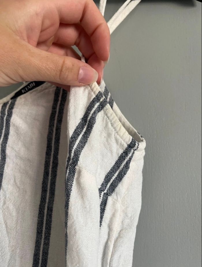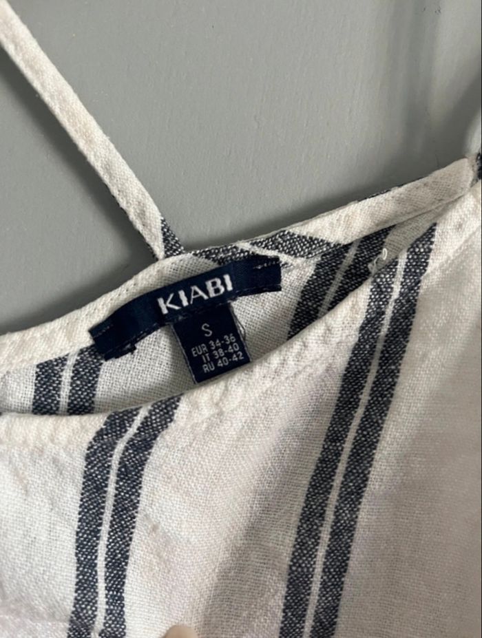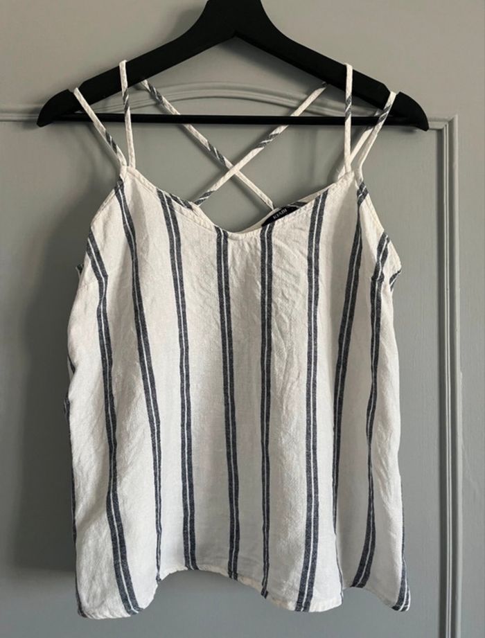 Top à bretelle rayé blanc et bleu de chez Kiabi, taille S, bon état (car un léger jaunissement sous les aisselles visible en photo).