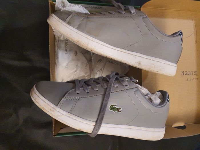 Bonjour, adoptez un look stylé sportif avec ses baskets grises Lacoste. Parfaite pour toutes les occasions. Design intemporel. En bon état et prêt à vivre de nouvelles aventures. N'attendez plus pour marcher avec élégance. Prix tout doux. Baskets mixtes pour homme femme ou enfant.