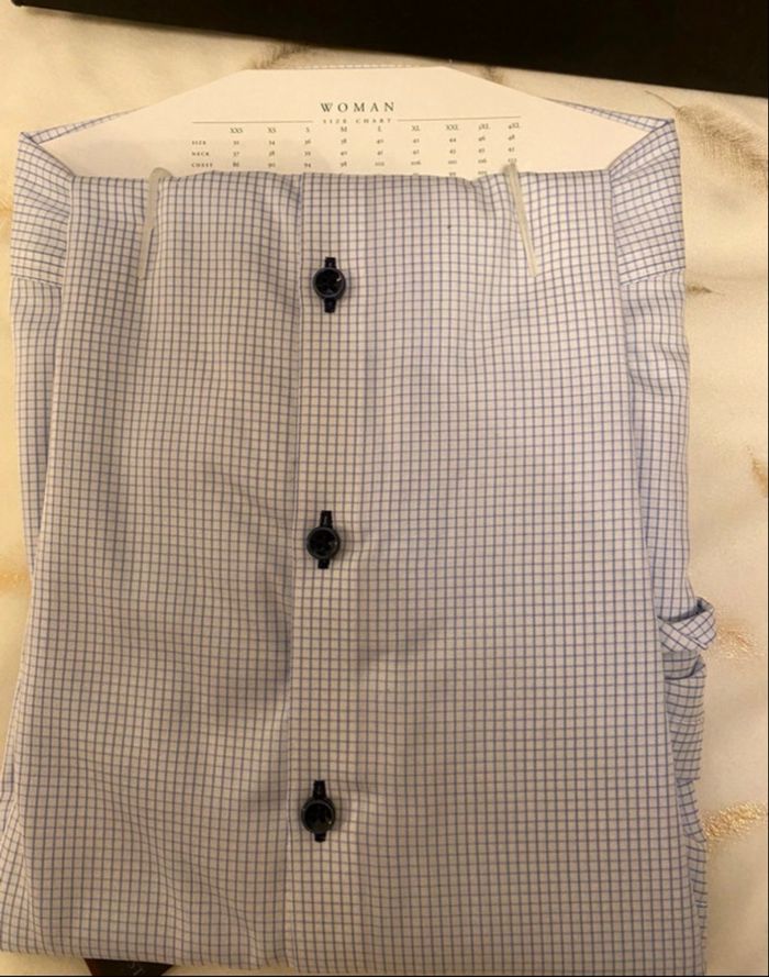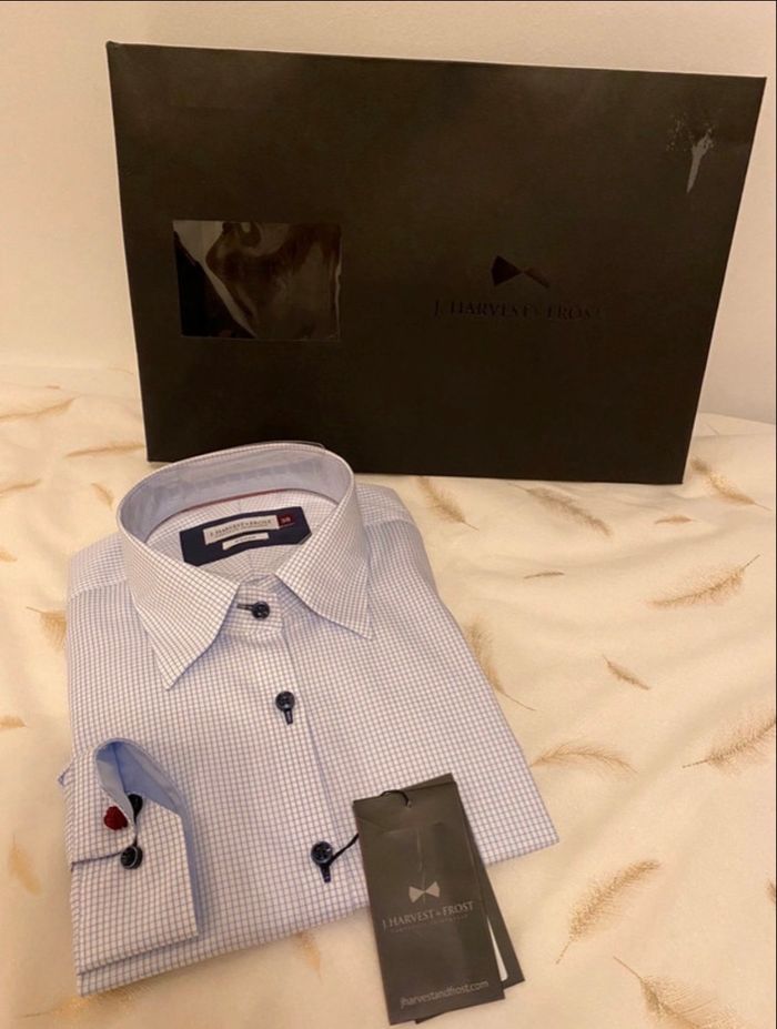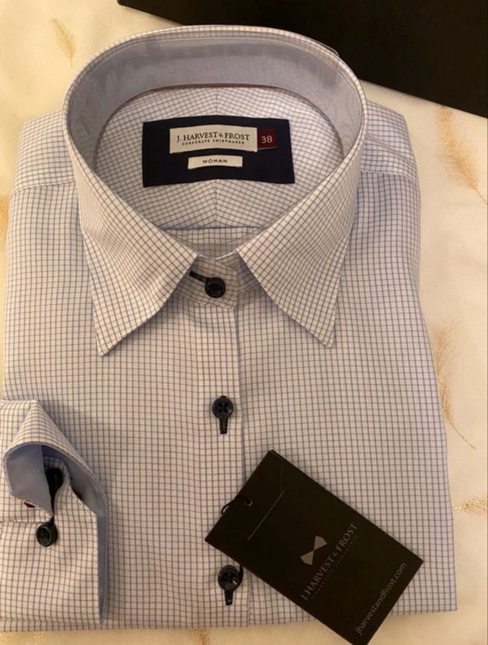 Chemise pour femme,idéale pour un style chic, parfaite aussi bien au bureau qu’en sortie. 📐 Taille: 38 🏷️ Etat : neuf avec boîte 🔖 Marque : J.Harvest & Frost 🎨 Couleur: Blanche avec carreaux bleu