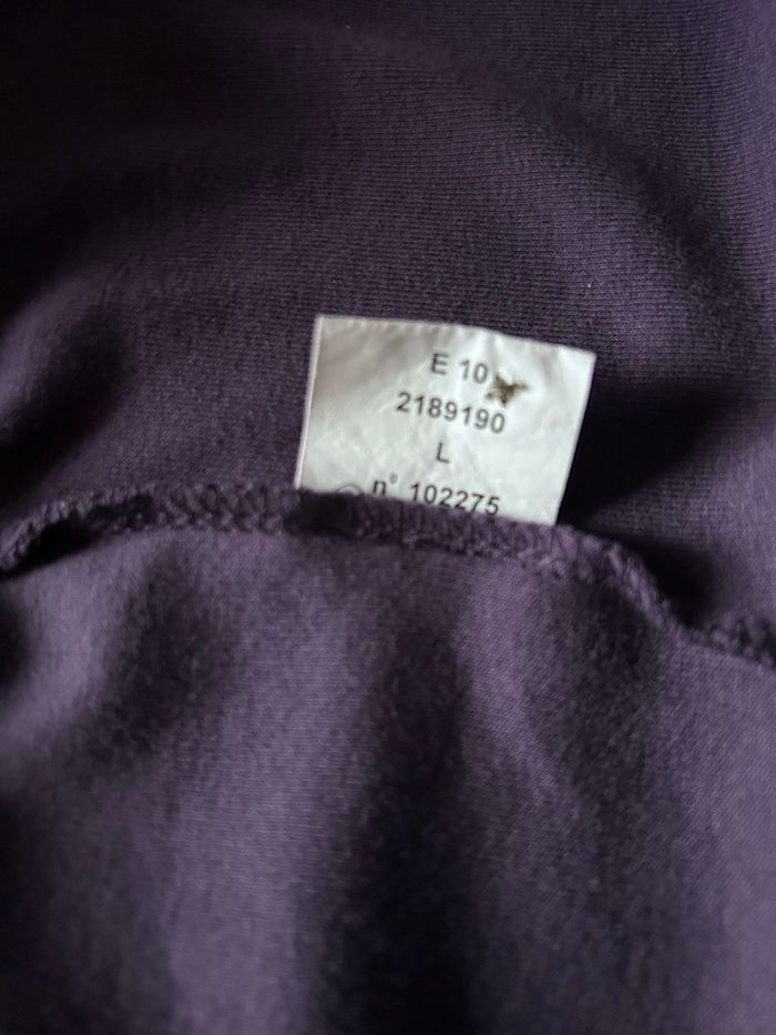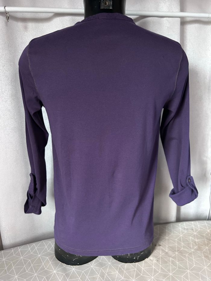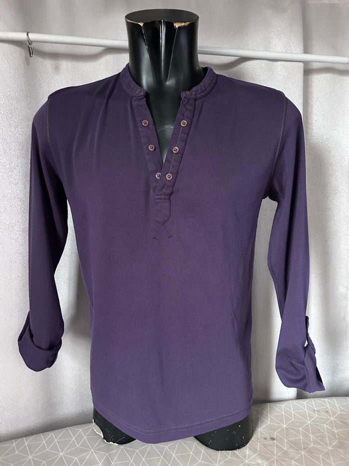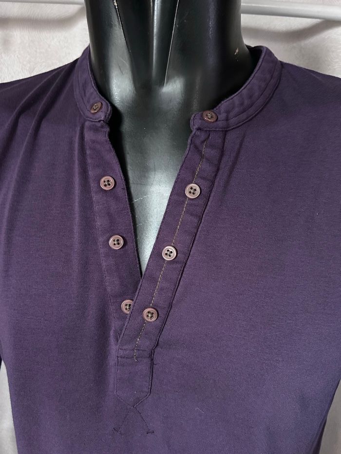 T-shirt en parfait état violet, certaines coutures beige kaki, encolure V avec boutons Manches longues avec pattes boutons pour remonter les manches Taille L 100% coton Devred Carrure 43 cm Aisselle à aisselle 51,8 cm longueur 67,7 cm