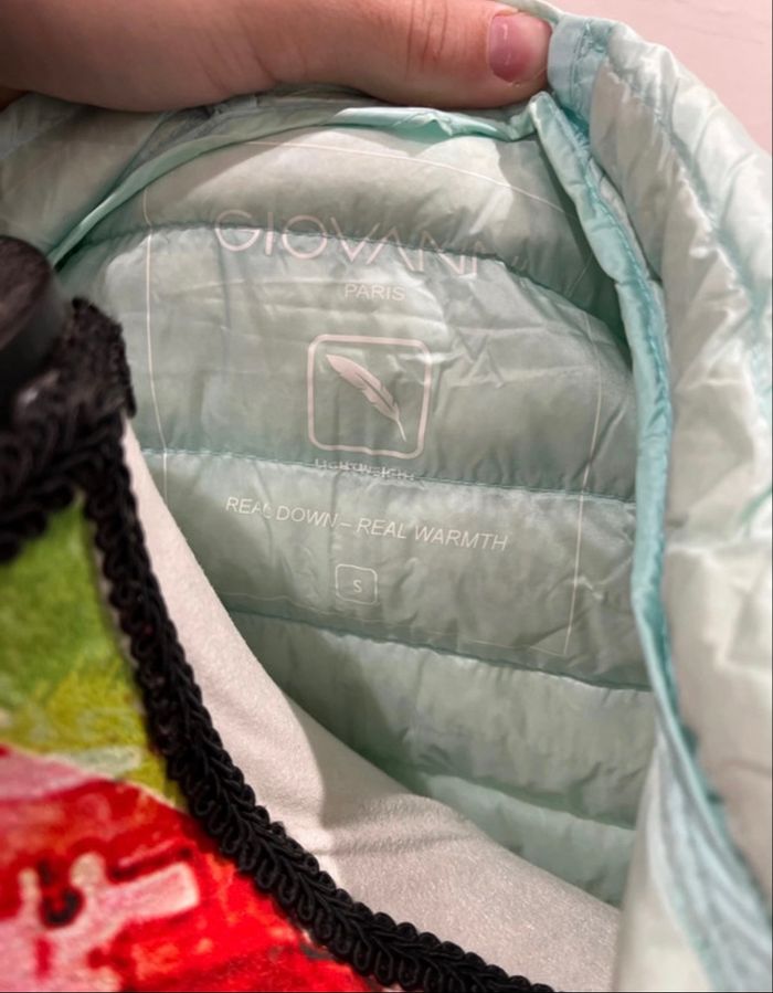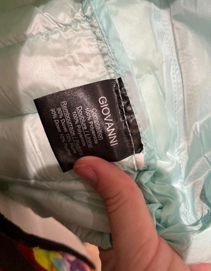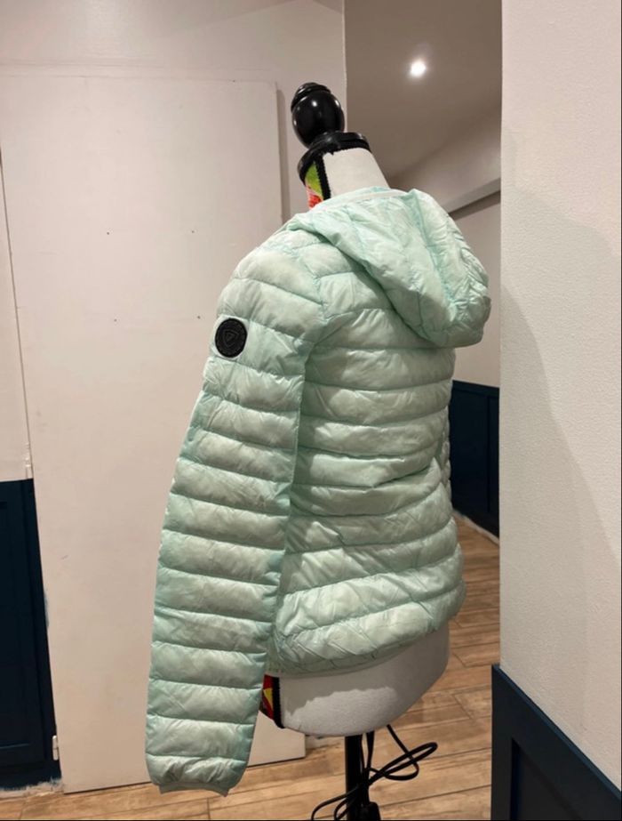 Doudoune portait une fois couleur bleue pastel Je l’ai acheté avec un défaut de couture, voir la dernière photo