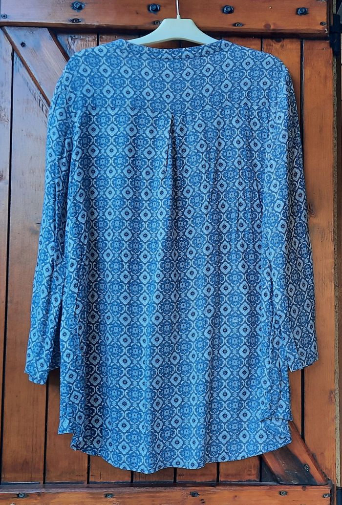 Je vends cette blouse imprimée bleue de la marque Influx, en taille 44. - Type de produit : Blouse - Marque : Influx - Taille : 44 - Couleur : Bleu - Motif : Imprimé bleu et blanc - Caractéristiques : manches 3/4, col en V avec 3 boutons, 1 poche plaquée sur la poitrine - Largeur d'épaule : 44 cm - Largeur sous les aisselles : 56 cm - Hauteur devant : 66 cm - Hauteur dos : 76 cm