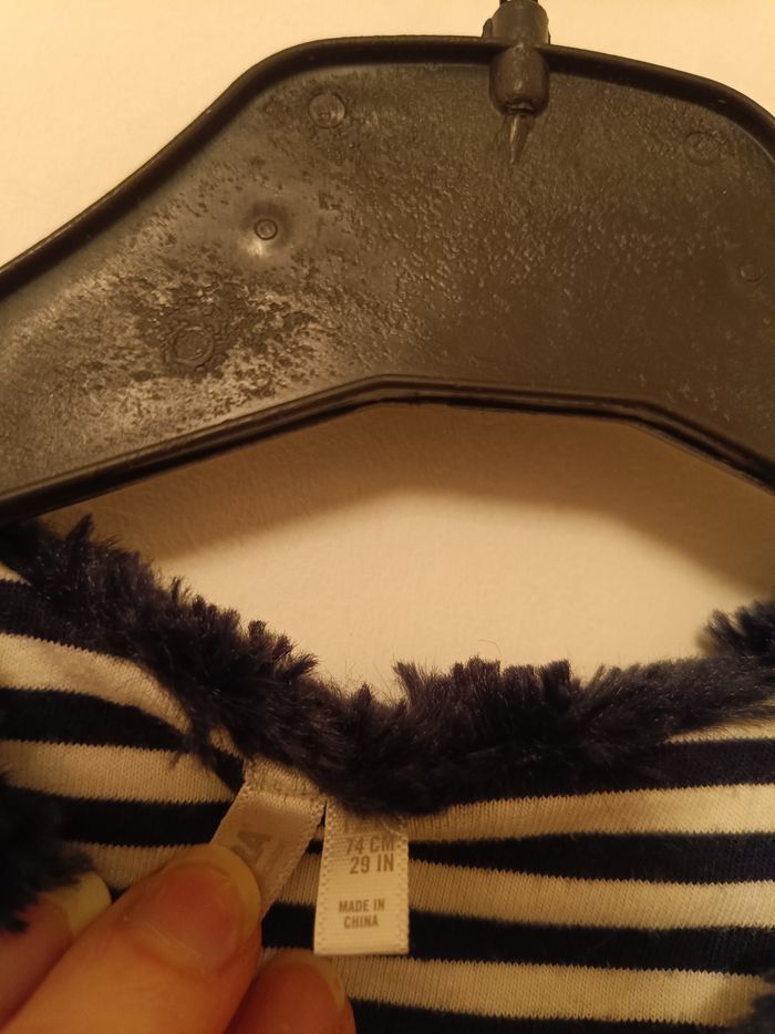 ce joli gilet sans manches pour bébé de la marque Orchestra. Matière : Extérieur en fausse fourrure ultra douce (aspect "rose" ou texturé) bleu marine. Doublure : Intérieur en coton rayé bleu marine et blanc (style marinière). Détails : Petit bouton de fermeture discret à l'avant avec une petite touche de rouge