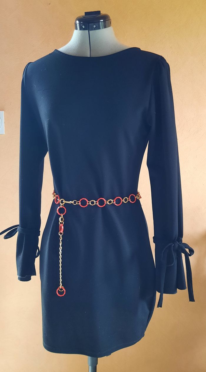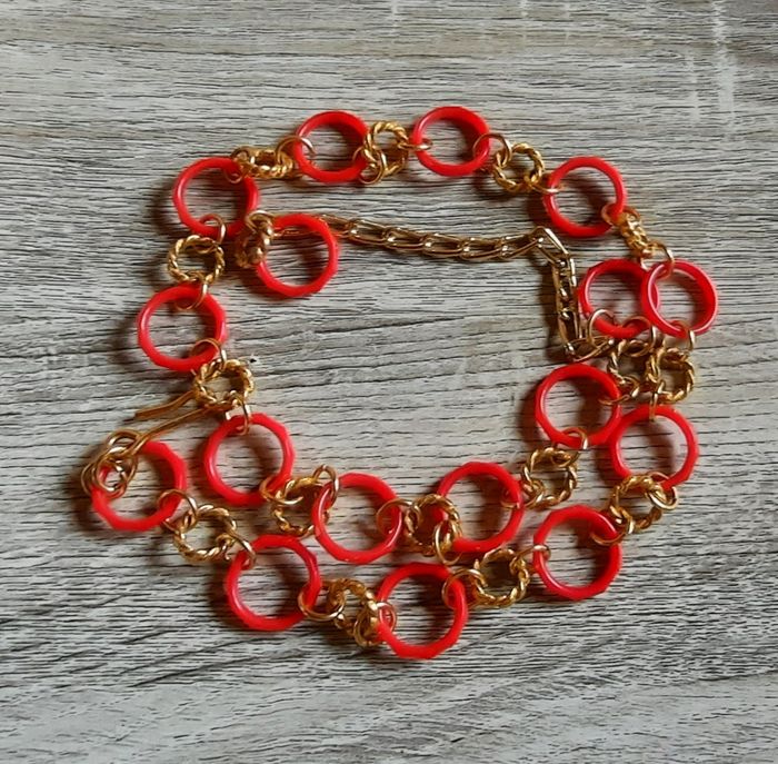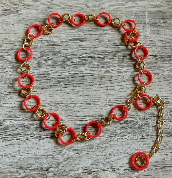Ceinture en plastique de couleur rouge et dorée. - Type de produit : Ceinture - Univers : Femme - Couleur : Rouge / Doré - Matière : Plastique - Longueur totale : 91 cm Très bon état