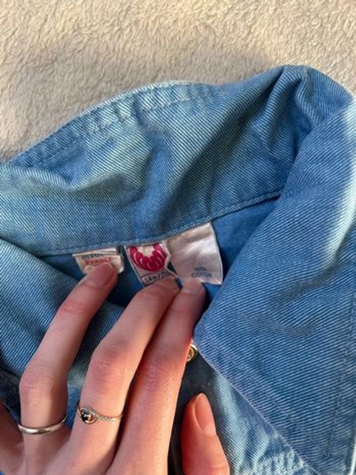 🩵 Veste en jean bleu, coupe courte. Taille indiquée 14 ans, convient aussi à un très petit gabarit adulte (XXS). Bon état. Présence de petits accrocs discrets, peu visibles une fois portée et sans impact sur l’usage. 📏 Mesures à plat : – Épaules : 35 cm – Aisselles : 41 cm – Longueur : 48 cm – Manches : 52 cm