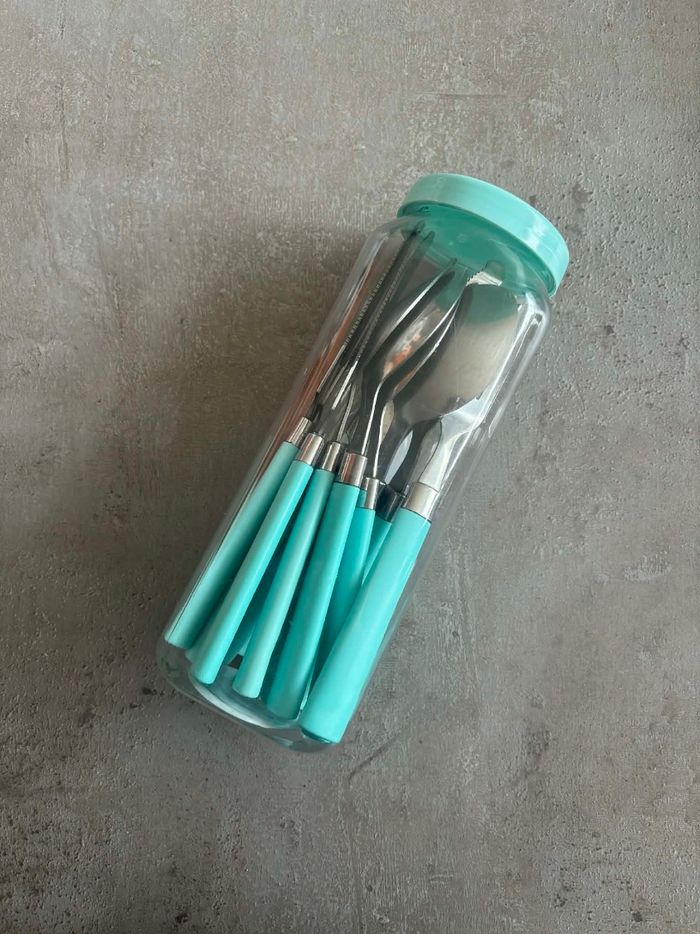 Lot de 15 couverts comprenant : ✔️ 5 couteaux ✔️ 5 grandes cuillères ✔️ 5 fourchettes Ensemble en très bon état, propres et prêts à l’emploi. Idéal pour compléter un service, équiper un logement, étudiant, location ou maison de vacances..