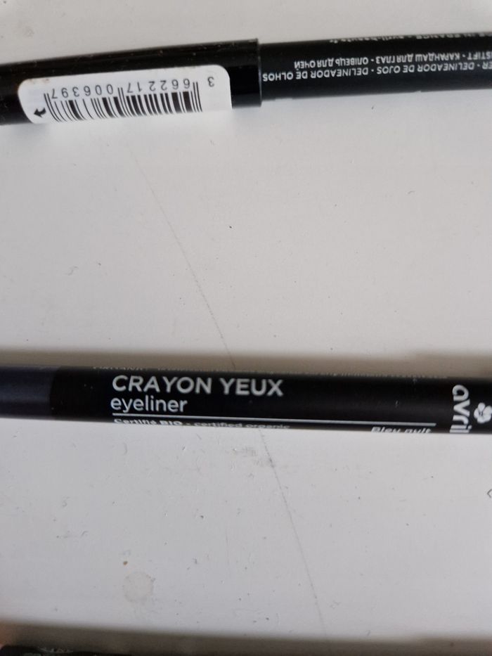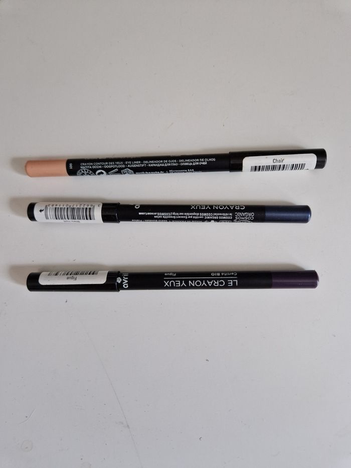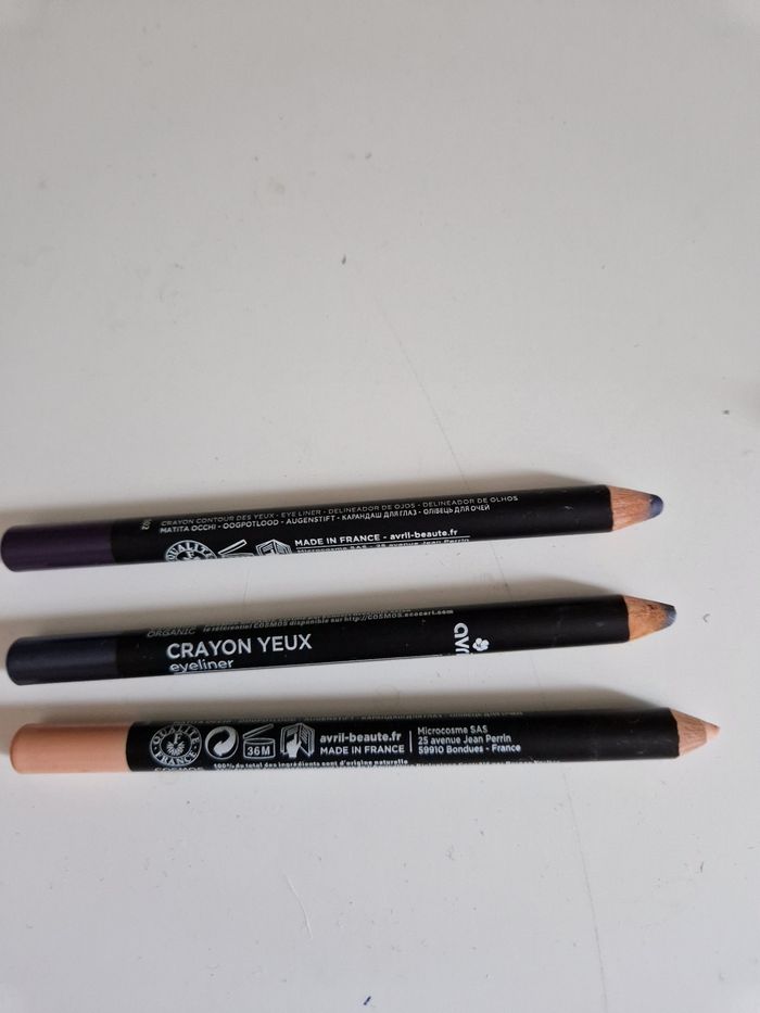 Vends un lot de 3 crayons pour les yeux de marque Avril. Très bon état juste légèrement commencé et même le chair il est neuf .