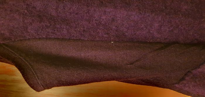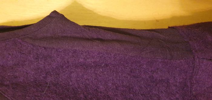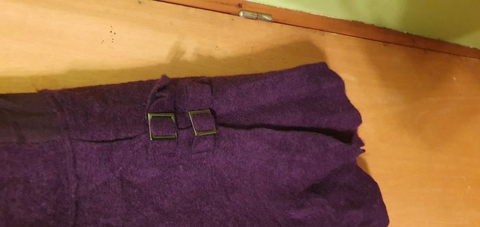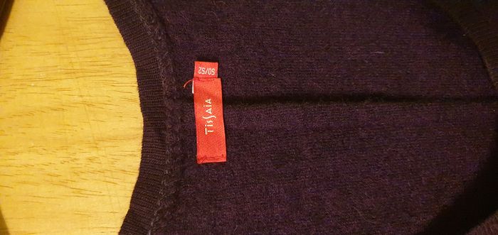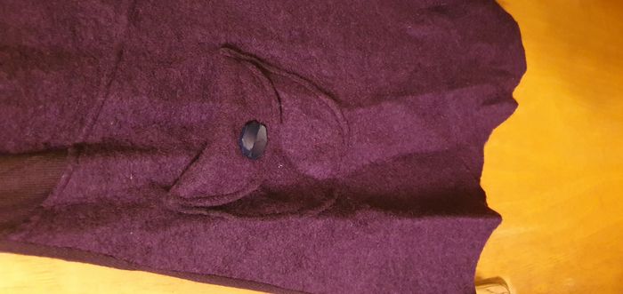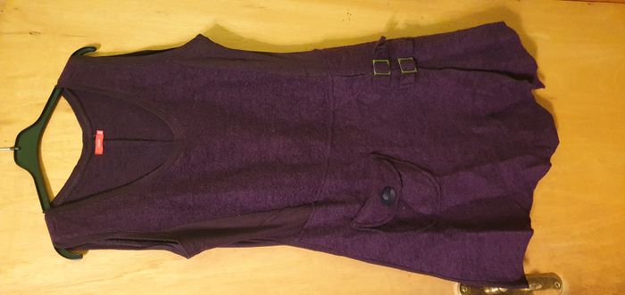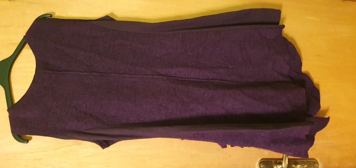 Tunique sans manches coloris violet foncé, marque Tissaia, taille 50/52, laine bouillie, 78% laine, 22% polyester et pour la partie tissu fine sur les côtés 100% acrylique, encolure ronde, découpe à la taille, 1 poche côté droit devant avec 1 bouton, 2 boucles côté gauche devant , bas de la tunique en pointe devant et derrière et bande jersey de chaque côté du buste. Largeur d'aisselle à aisselle 52cms, largeur à la découpe taille basse 49cms, longueur + courte/côté 85cms, + longue/pointe 100cms.