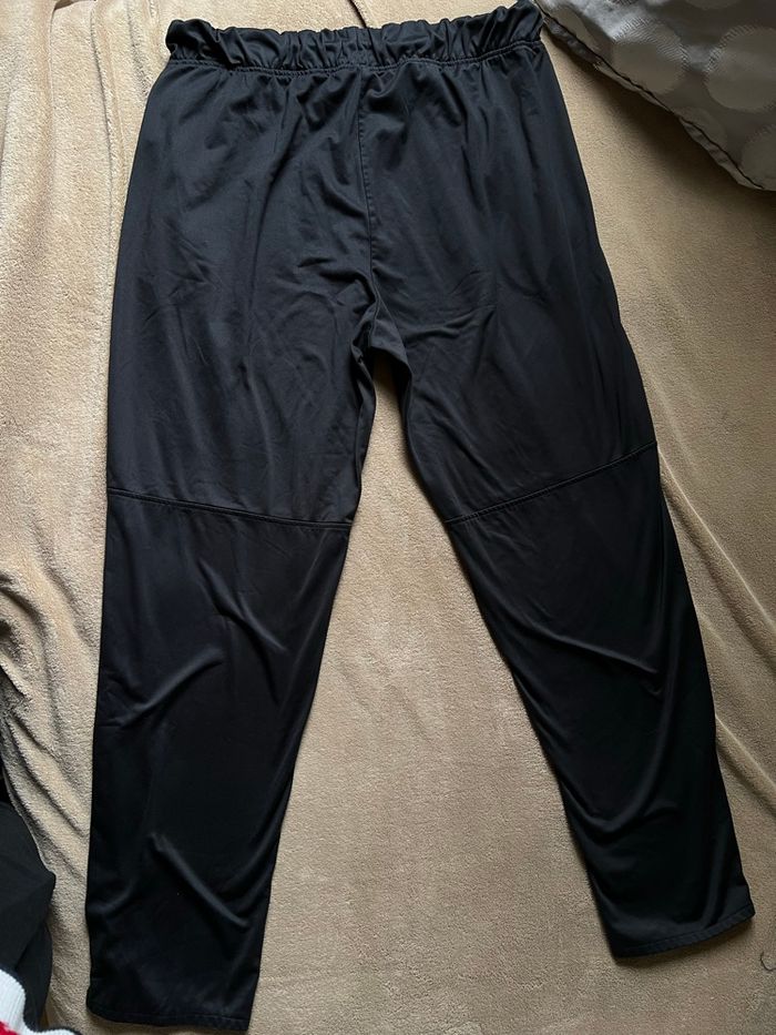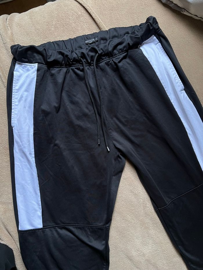 🖤 Pantalon de sport noir à bandes blanches Taille XXL — en très bon état. Confortable, taille élastique avec cordon de serrage. 📏 Mesures à plat : • Taille : 42 cm (élastique) • Hanches : 64 cm • Longueur : 103 cm • Hauteur de taille : 32 cm