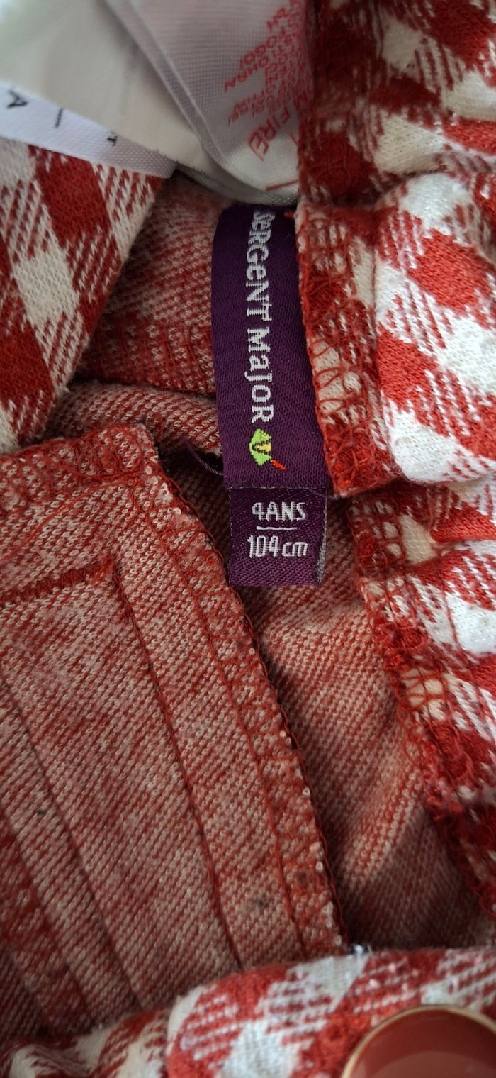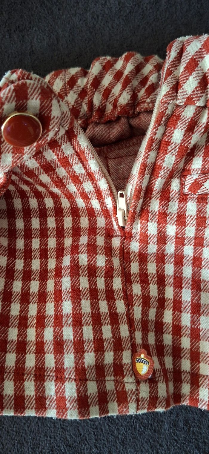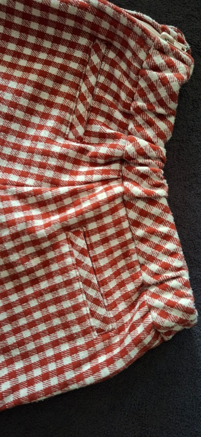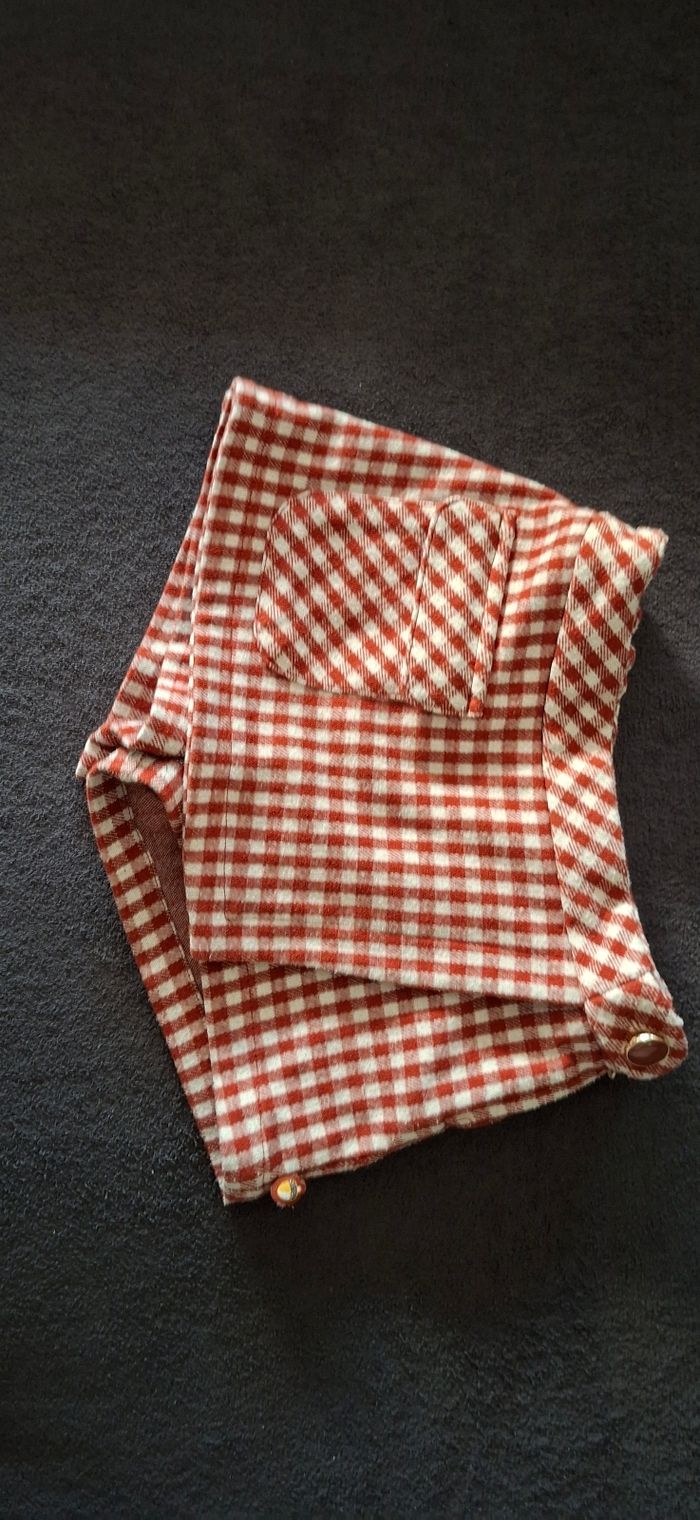 Jupe short carreaux marron brique et blanc . Pour fillette de 4 ans , 104 cm . 1 petite poche avant . 2 poches arrière. Matière polyester , coton et élasthane ;Joli bouton marron et doré sur le côté ; très chic . Élastique sur la taille avec une fermeture éclair sur le côté.