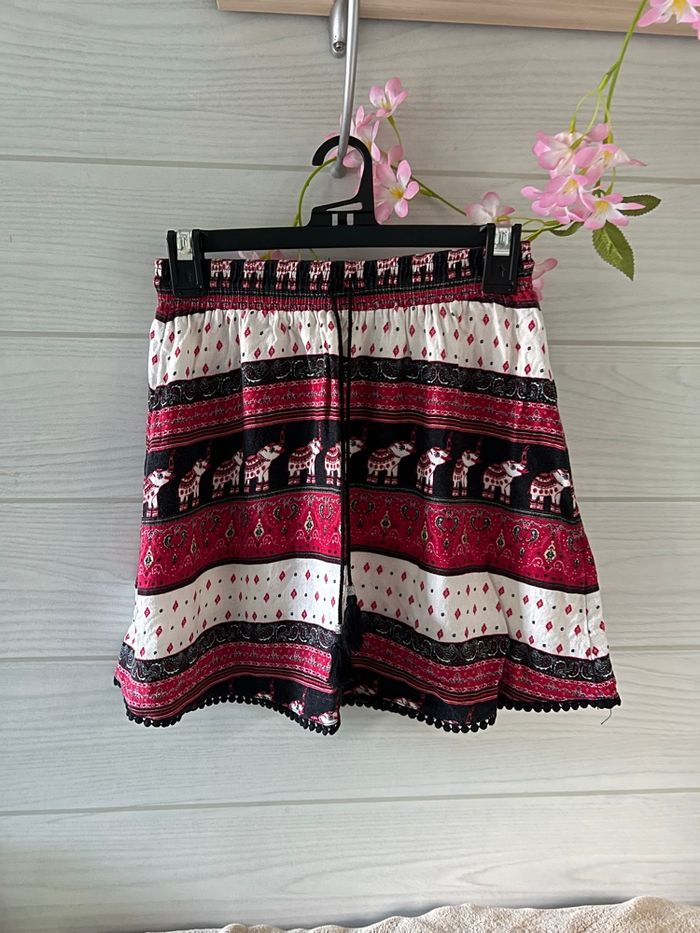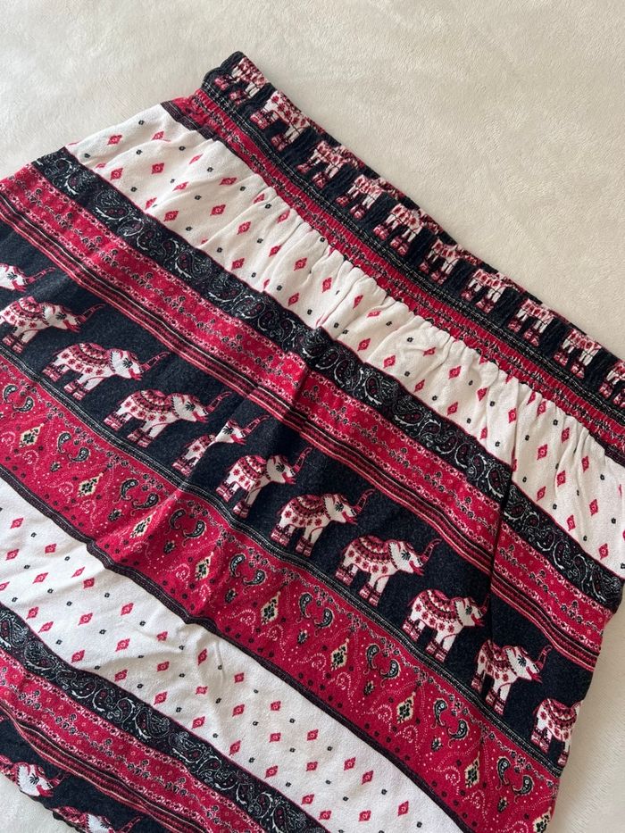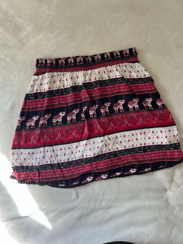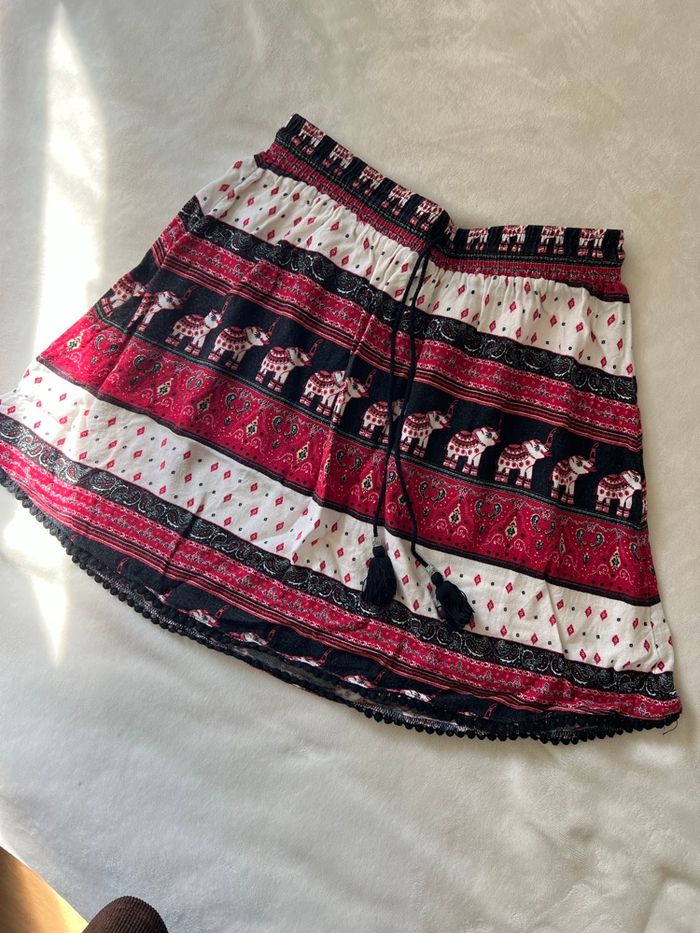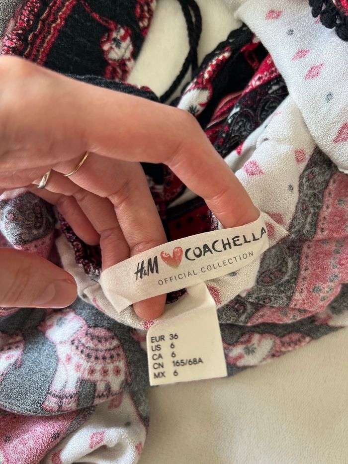 Jolie jupe de la collection capsule H&M Coachella 🎶, avec un imprimé bohème et un petit lien à nouer à la taille. Longueur : 41 cm Largeur à plat : 32 cm (taille élastique) Taille : 36 / S Très bon état ✨