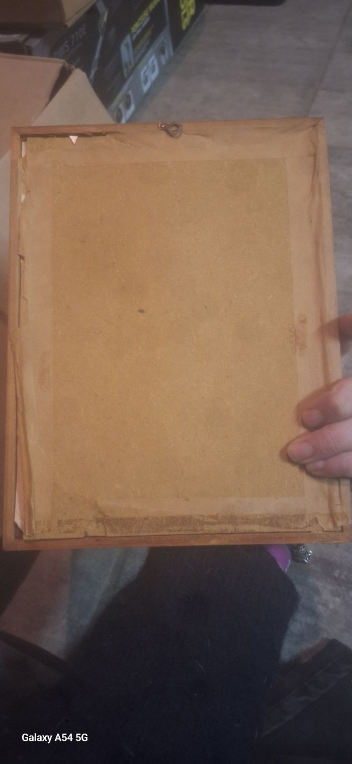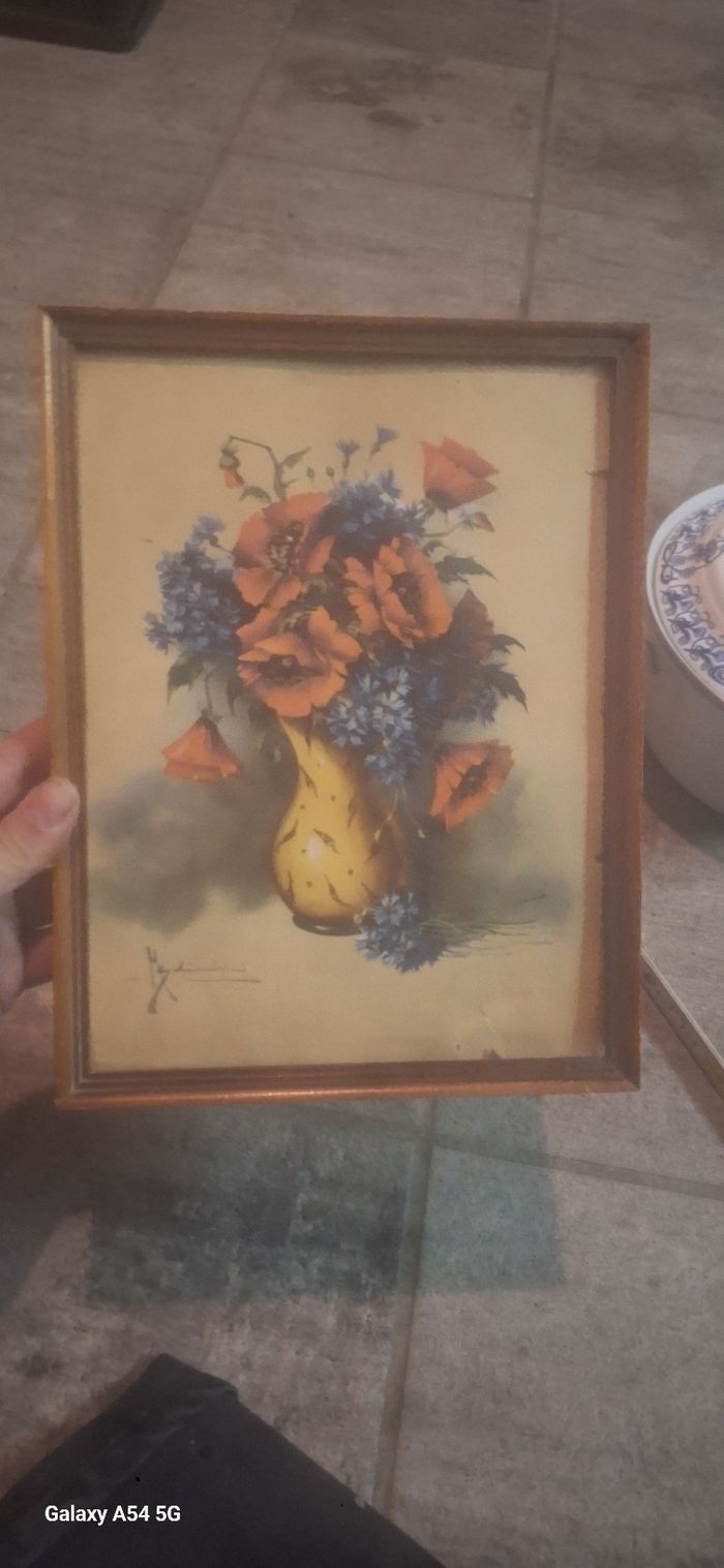 stampe encadrée représentant un bouquet de fleurs dans un vase. Les fleurs principales sont des coquelicots rouges et des fleurs bleues, vraisemblablement des myosotis ou des campanules. Le vase est de couleur jaune avec des motifs. La peinture est signée en bas à gauche. Mario Salimbeni