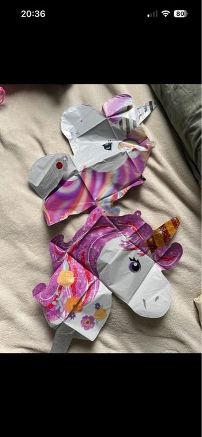 Le lot comprend : deux peluches étoiles, un ourson rose, une poupée-escargot et deux ballons licorne (neufs). Idéal pour jeux, déco ou anniversaire. Ensemble propre, sans odeurs ni défauts.