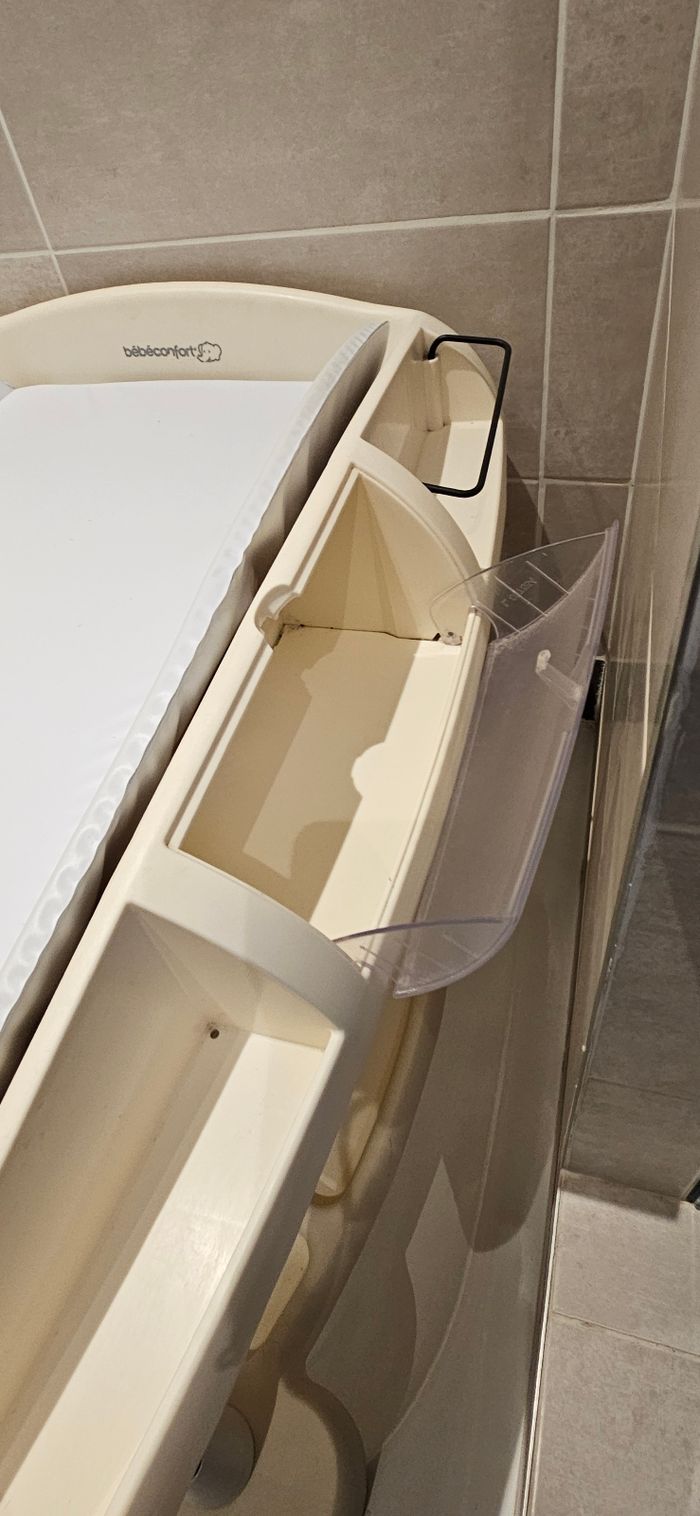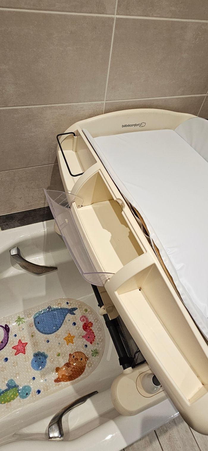 Pratique et peu encombrante, cette table à langer Bébé Confort se place directement sur la baignoire, idéale pour les petits espaces ou les bains de bébé.