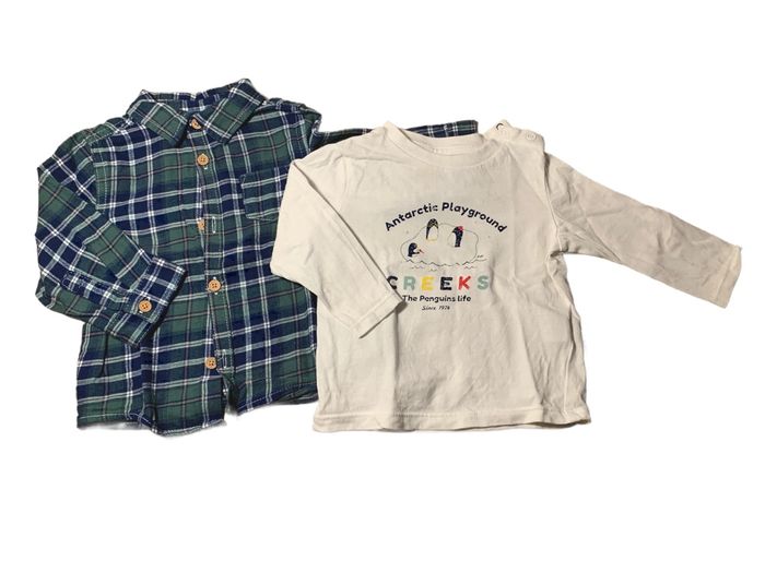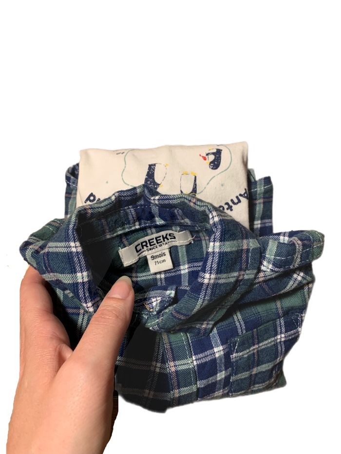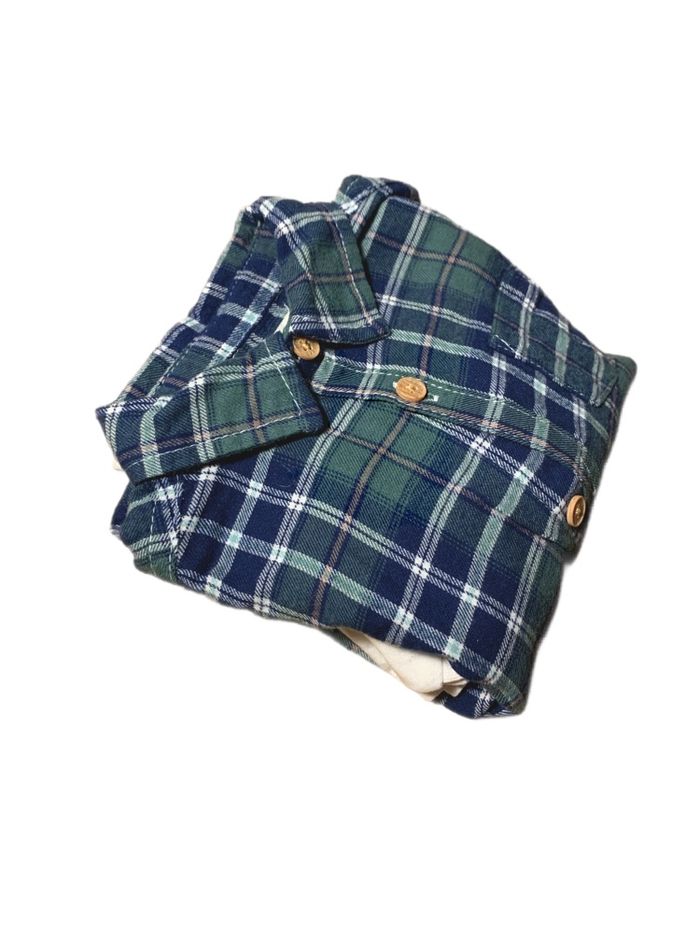 Ensemble comprenant un t-shirt à manches longues et une chemise à carreaux. En parfait état, taille 9 mois.