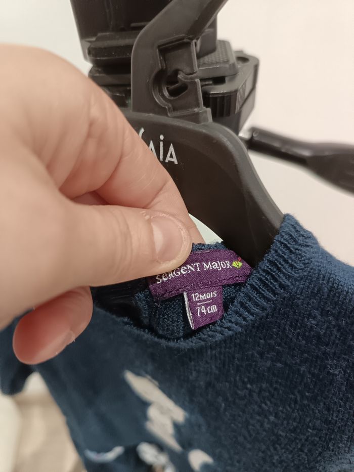 Adorable robe-pull en maille bleu marine pour petite fille, marque Sergeant Major Motif brodé super craquant : une petite hermine (ou fouine) blanche toute mignonne avec une couronne sur la tête, les pattes croisées et la queue en panache ! 🐾👑 Manches longues, col rond, bas évasé en forme de jupe peplum avec 3 petites nœuds en tissu liberty fleuri bleu/blanc pour un look ultra féminin et tendance. Très douce, confortable et chaude pour l'automne/hiver. État : très bon état pas accro Taille : 12 mois Marque : Sergeant Major Couleur : bleu marine Parfait pour les photos, les sorties, Noël ou un look quotidien chic et kawaii ! Idéale pour les petites princesses fans d'animaux mignons. 💙 Envoi soigné et rapide.